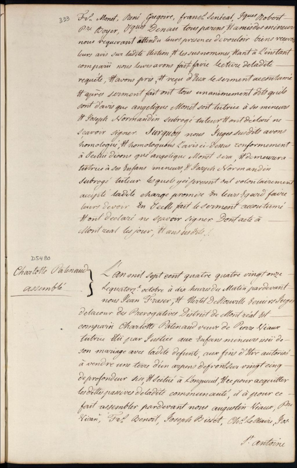 Tutelle des enfants mineurs de feu Pierre Viau et de Charlotte Patenaude - Administration tutélaire, 14 octobre 1791, Archives nationales à Montréal, Fonds Cour supérieure. District judiciaire de Montréal. Procédures en matières non contentieuses, (06M,CP601,S5,D5480).