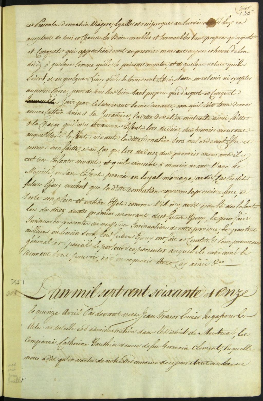 Tutelle de enfant mineur de feu Germain Clément et de Catherine Gauthier, 15 avril 1771, Archives nationales à Montréal, Fonds Cour supérieure. District judiciaire de Montréal. Procédures en matières non contentieuses, (06M,CP601,S5,D551).