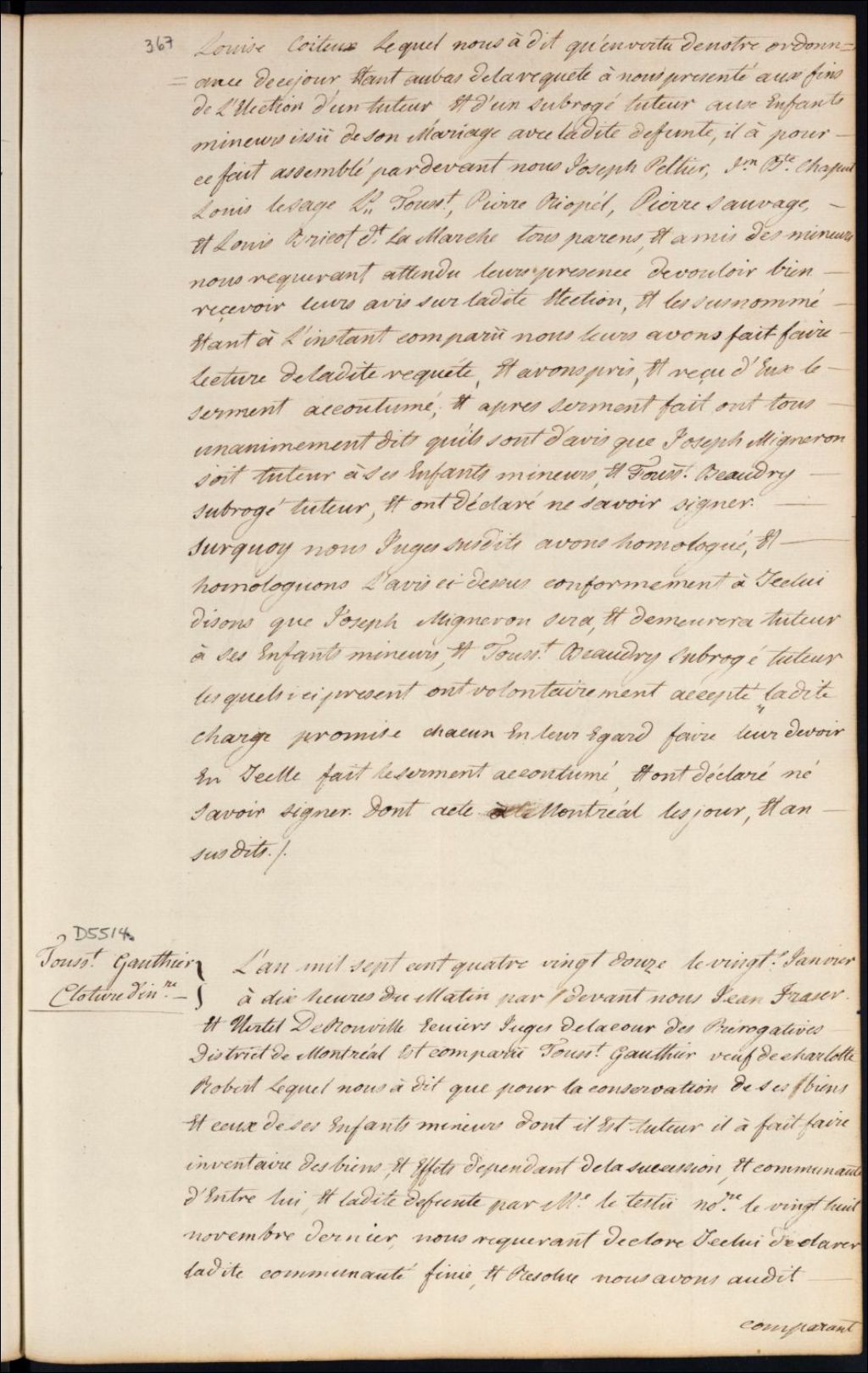 Clôture d'inventaire des biens de la succession et de la communauté de feu Charlotte Robert et Toussaint Gauthier, 20 janvier 1792, Archives nationales à Montréal, Fonds Cour supérieure. District judiciaire de Montréal. Procédures en matières non contentieuses, (06M,CP601,S5,D5514).