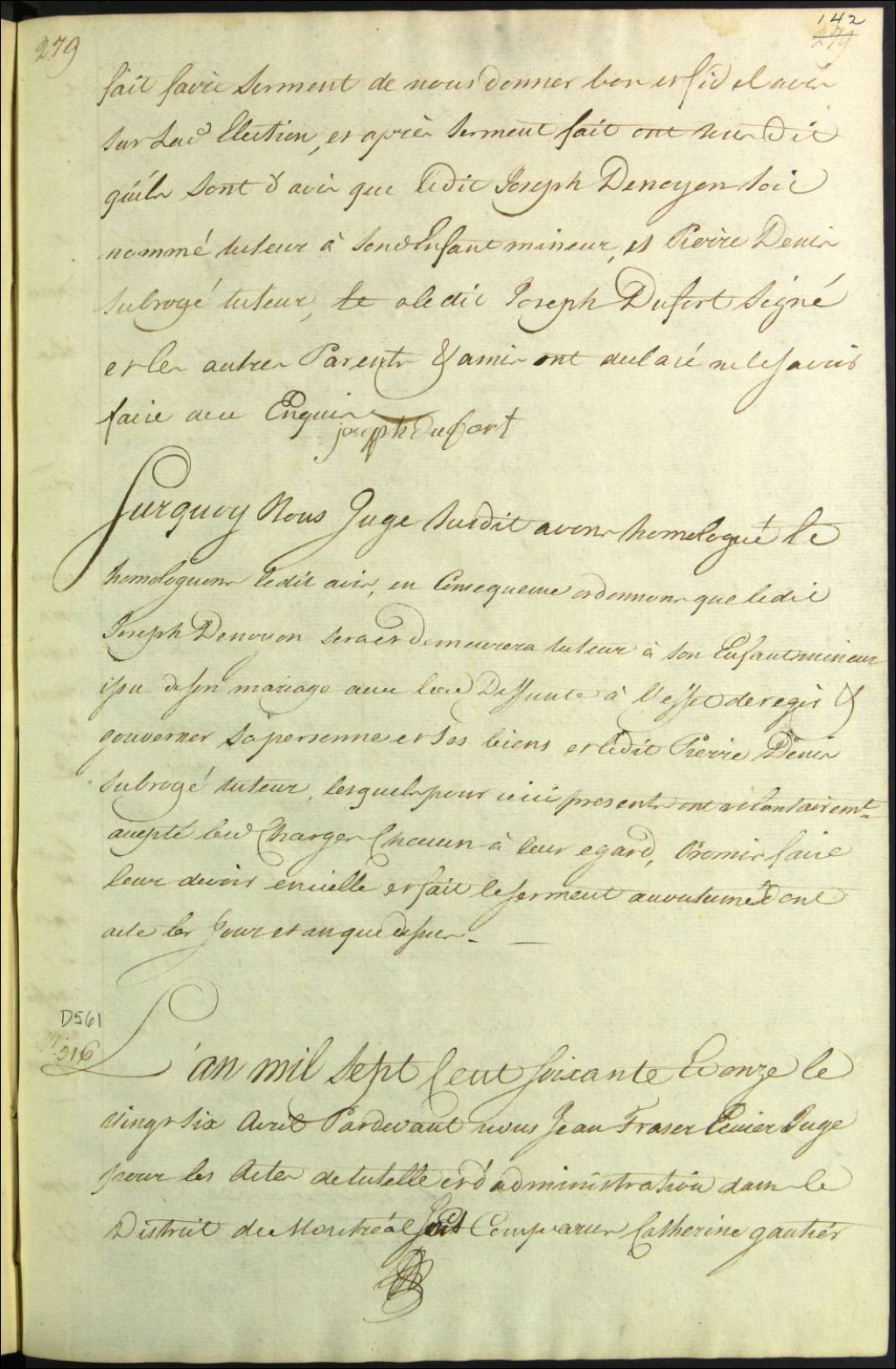 Tutelle de l'enfant mineur de feu Germain Clément et de Catherine Gauthier - Administration tutélaire, 26 avril 1771, Archives nationales à Montréal, Fonds Cour supérieure. District judiciaire de Montréal. Procédures en matières non contentieuses, (06M,CP601,S5,D561).
