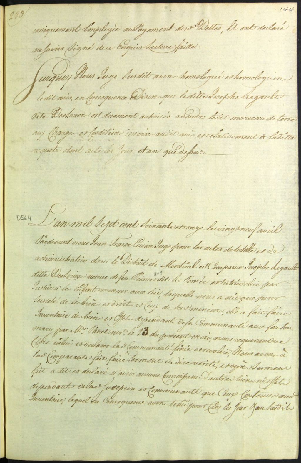 Clôture d'inventaire des biens de la succession et de la communauté de feu Pierre Roy LaPensée et Josèphe Legault Deslauriers, 29 avril 1771, Archives nationales à Montréal, Fonds Cour supérieure. District judiciaire de Montréal. Procédures en matières non contentieuses, (06M,CP601,S5,D564).