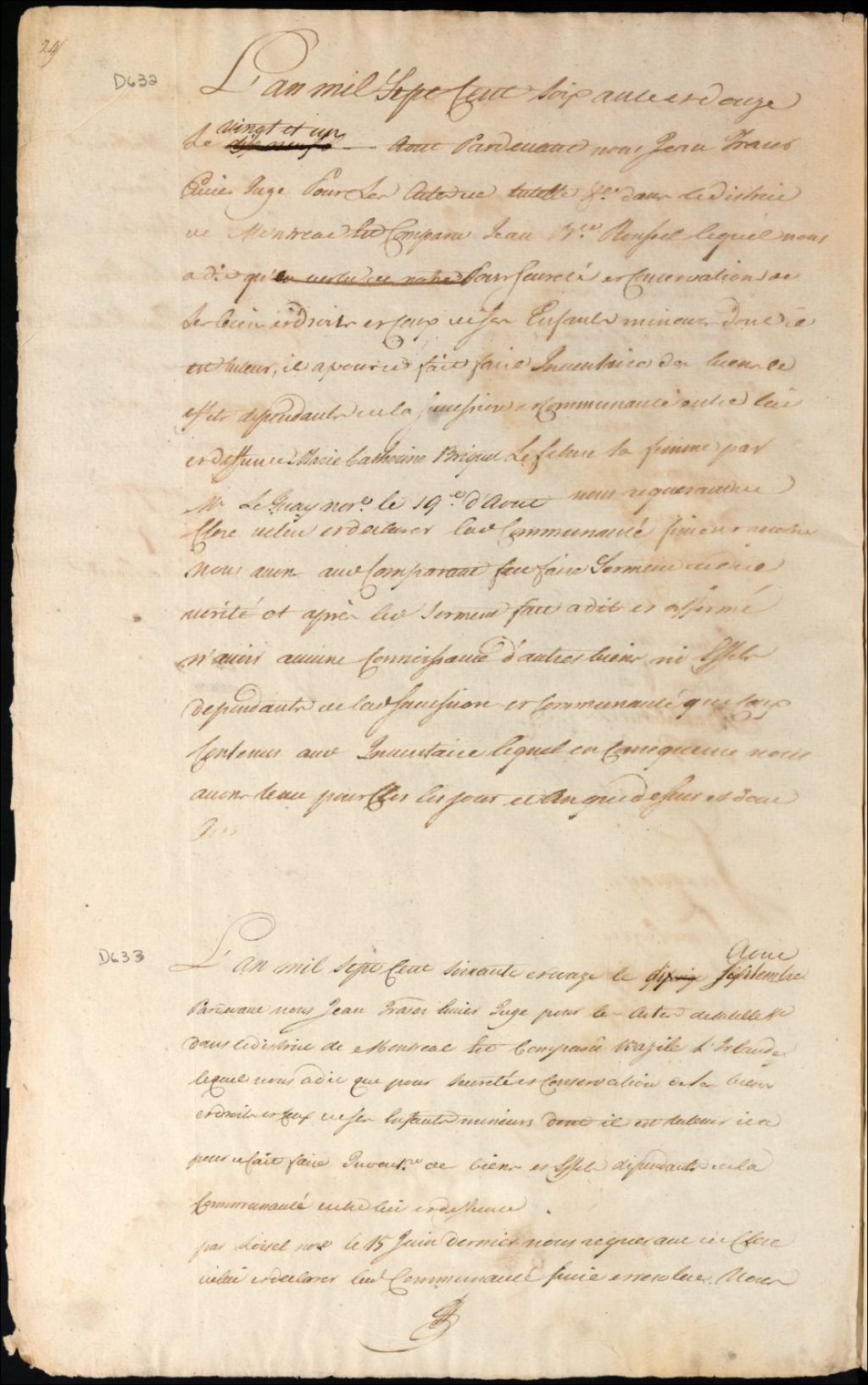 Clôture d'inventaire des biens de la succession et de la communauté de feu [Marie Louise Amable Boyer ?] et Basile Lirlande [Basile Riel Lirlande], 10 août 1772, Archives nationales à Montréal, Fonds Cour supérieure. District judiciaire de Montréal. Procédures en matières non contentieuses, (06M,CP601,S5,D633).
