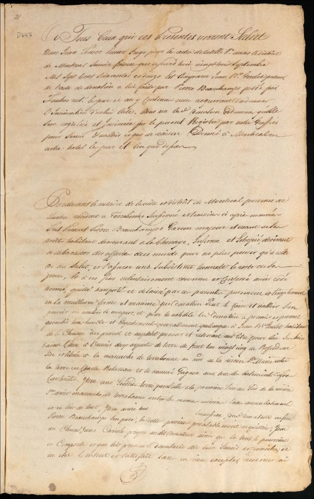 Insinuation de la donation de Pierre Beauchamp à Jean Baptiste Goulet, 23 septembre 1772, Archives nationales à Montréal, Fonds Cour supérieure. District judiciaire de Montréal. Procédures en matières non contentieuses, (06M,CP601,S5,D642).
