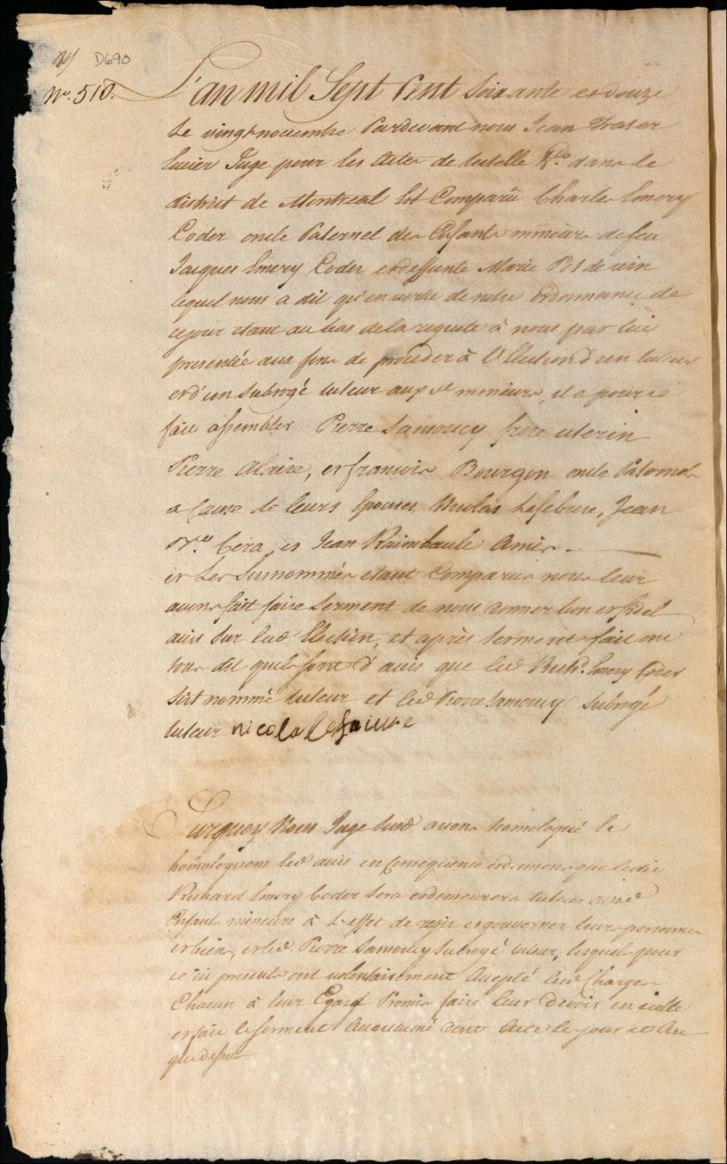 Tutelle des enfants mineurs des défunts Jacques Émery Coderre et Marie Potdevin [Marie Anne Roy Poitevin], 20 novembre 1772, Archives nationales à Montréal, Fonds Cour supérieure. District judiciaire de Montréal. Procédures en matières non contentieuses, (06M,CP601,S5,D690).