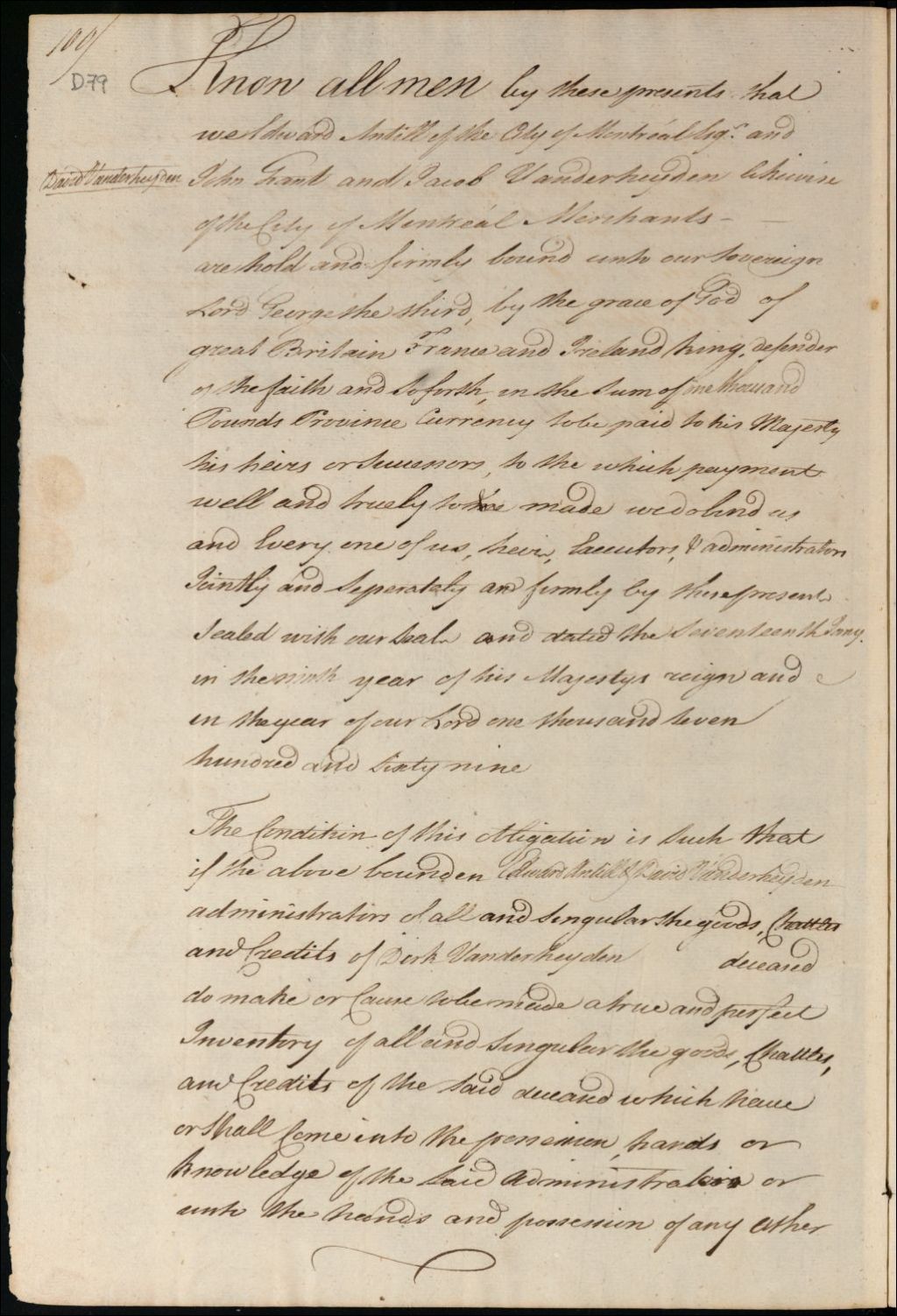 Insinuation de l'obligation de John Grant, Edward Antill et David Vanderheyden envers Sa Majesté relativement à la succession de Dirk Vanderheyden, 17 janvier 1769, Archives nationales à Montréal, Fonds Cour supérieure. District judiciaire de Montréal. Procédures en matières non contentieuses, (06M,CP601,S5,D79).