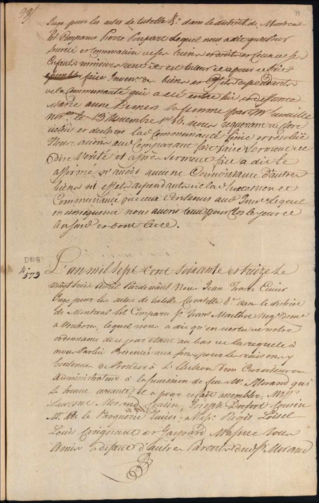Curatelle de la succession vacante de feu M. Morand, cousin de Laurent Morand et de Joseph Dufort, 23 avril 1773, Archives nationales à Montréal, Fonds Cour supérieure. District judiciaire de Montréal. Procédures en matières non contentieuses, (06M,CP601,S5,D818).