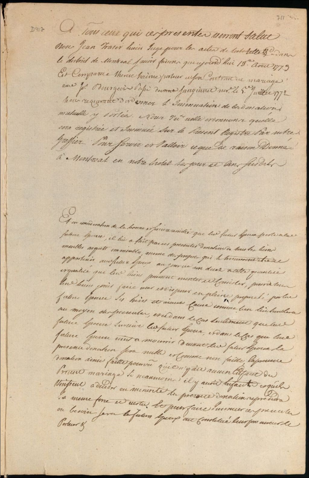 Insinuation de la donation portée au contrat de mariage entre Thérèse Hainse [Thérèse Hinse] et Joseph Bourgeois, 18 août 1773, Archives nationales à Montréal, Fonds Cour supérieure. District judiciaire de Montréal. Procédures en matières non contentieuses, (06M,CP601,S5,D912).