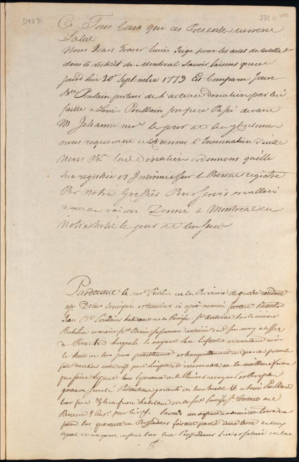 Insinuation de la donation de Jean Baptiste Poullain [Jean Baptiste Poulin] à Louis Poullain [Louis Poulin], 20 septembre 1773, Archives nationales à Montréal, Fonds Cour supérieure. District judiciaire de Montréal. Procédures en matières non contentieuses, (06M,CP601,S5,D933).