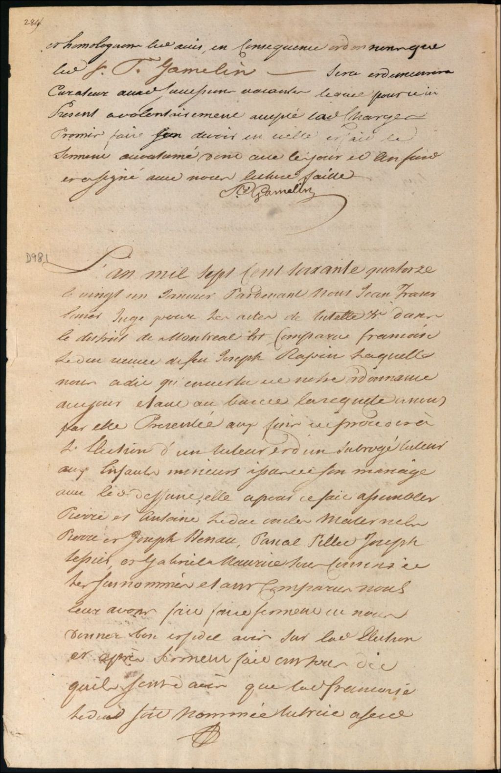 Tutelle des enfants mineurs de feu Joseph Rapin et de Françoise Leduc, 21 janvier 1774, Archives nationales à Montréal, Fonds Cour supérieure. District judiciaire de Montréal. Procédures en matières non contentieuses, (06M,CP601,S5,D981).