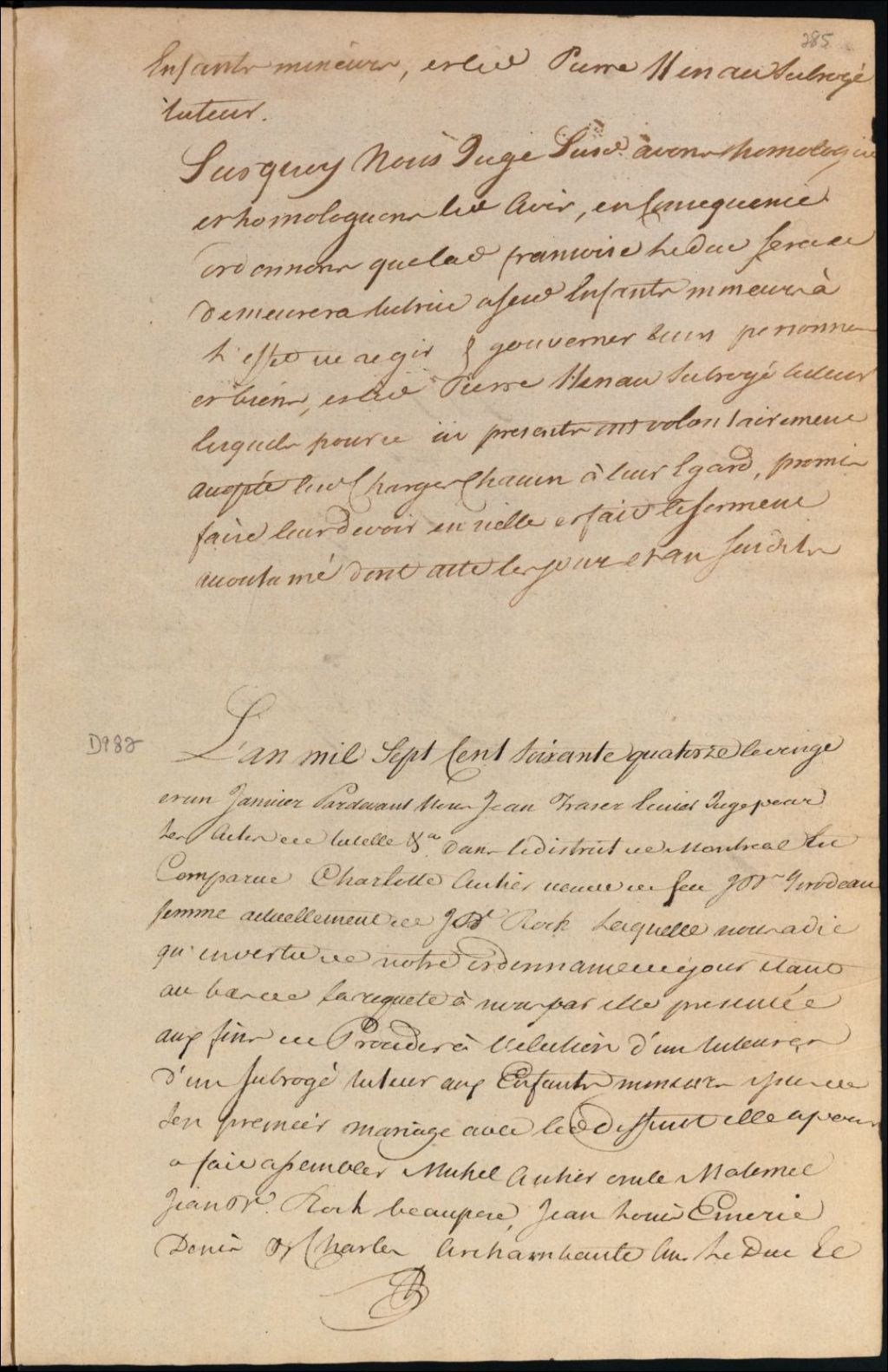Tutelle des enfants mineurs de feu Joseph [Gendreau ?] et de Charlotte Autier, 21 janvier 1774, Archives nationales à Montréal, Fonds Cour supérieure. District judiciaire de Montréal. Procédures en matières non contentieuses, (06M,CP601,S5,D982).