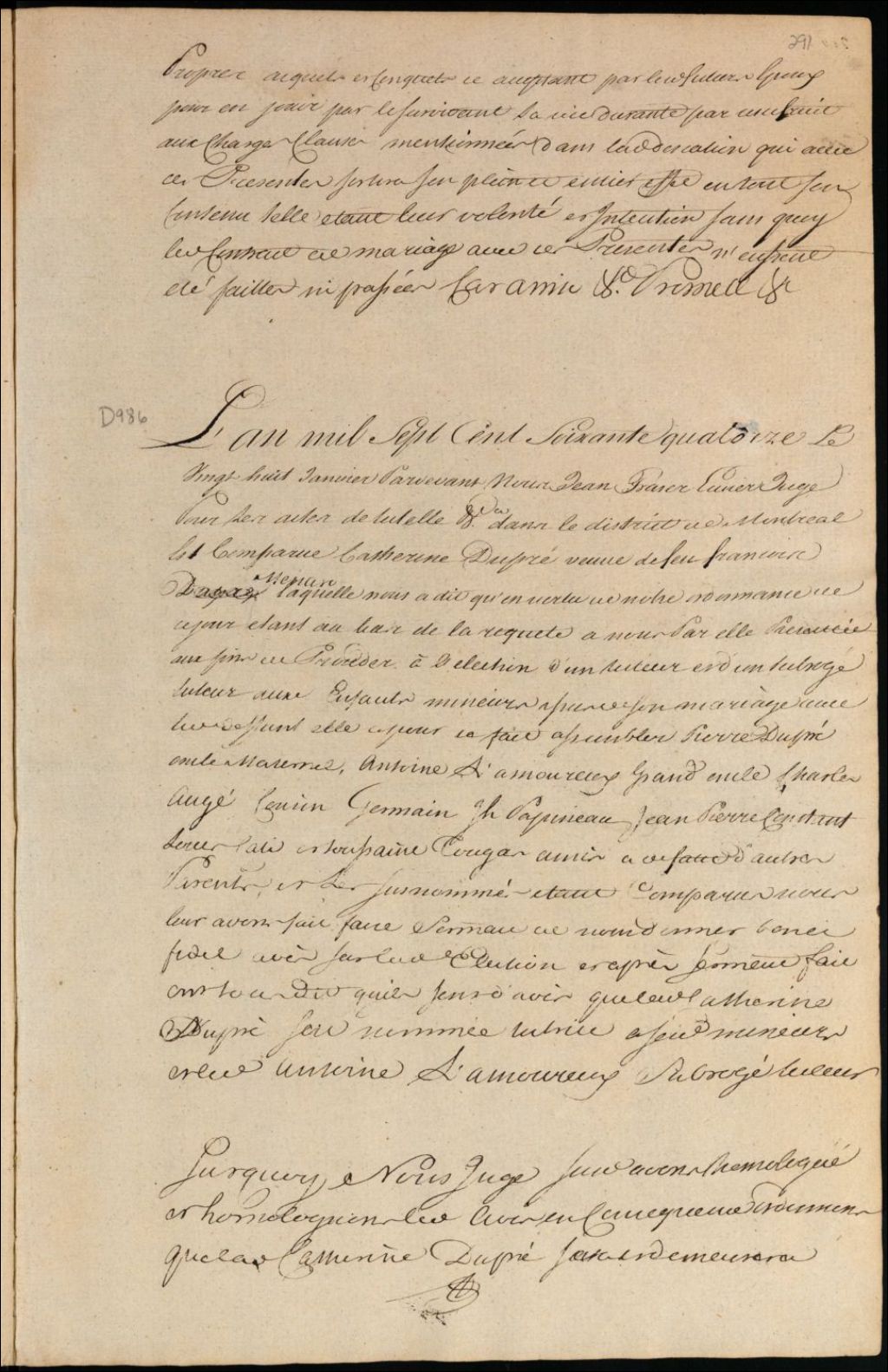 Tutelle des enfants mineurs de feu François Ménard et de Catherine Dupré, 28 janvier 1774, Archives nationales à Montréal, Fonds Cour supérieure. District judiciaire de Montréal. Procédures en matières non contentieuses, (06M,CP601,S5,D986).