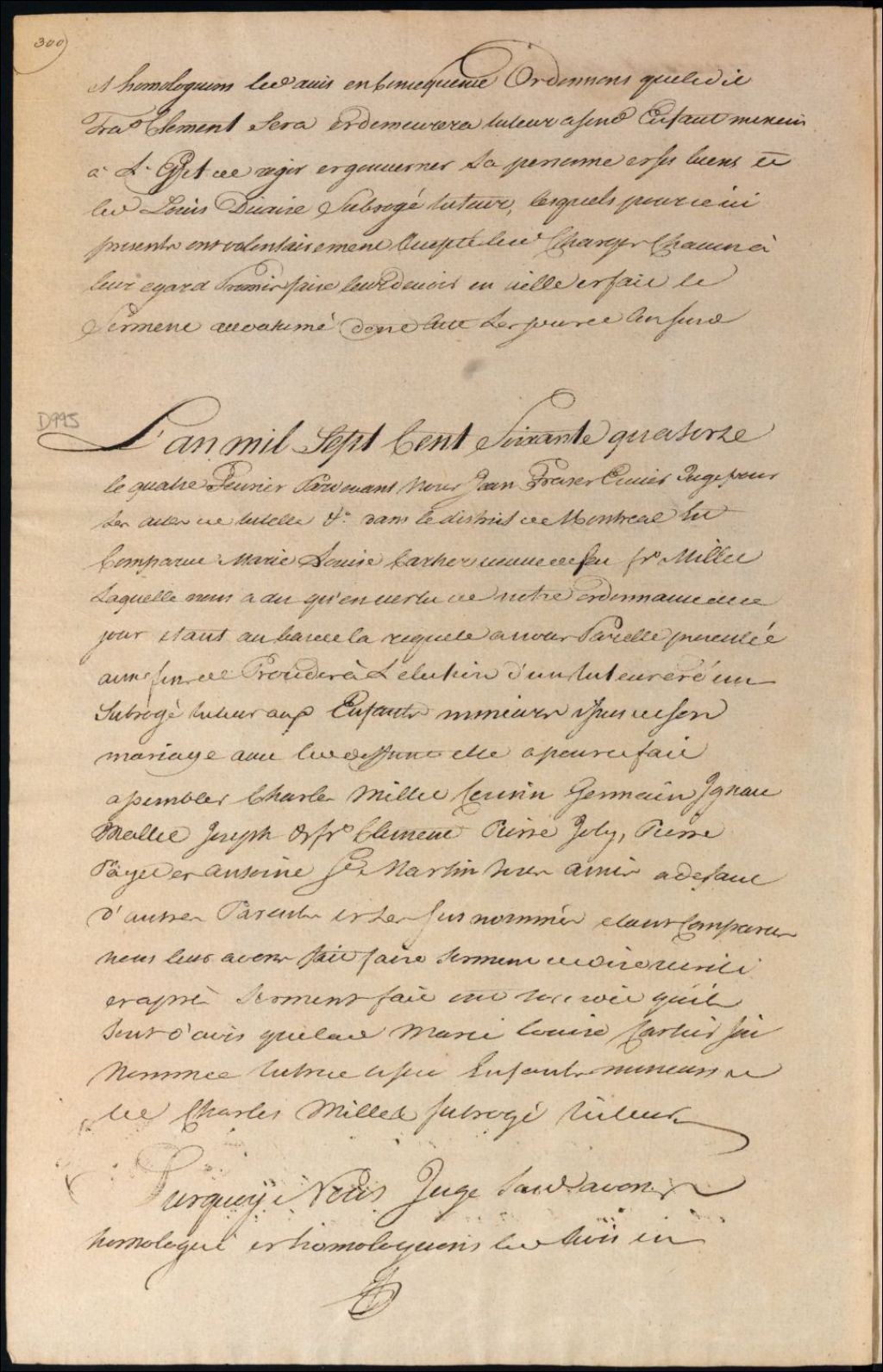 Tutelle des enfants mineurs de feu François Millet et de Marie Louise Cartier, 4 février 1774, Archives nationales à Montréal, Fonds Cour supérieure. District judiciaire de Montréal. Procédures en matières non contentieuses, (06M,CP601,S5,D995).