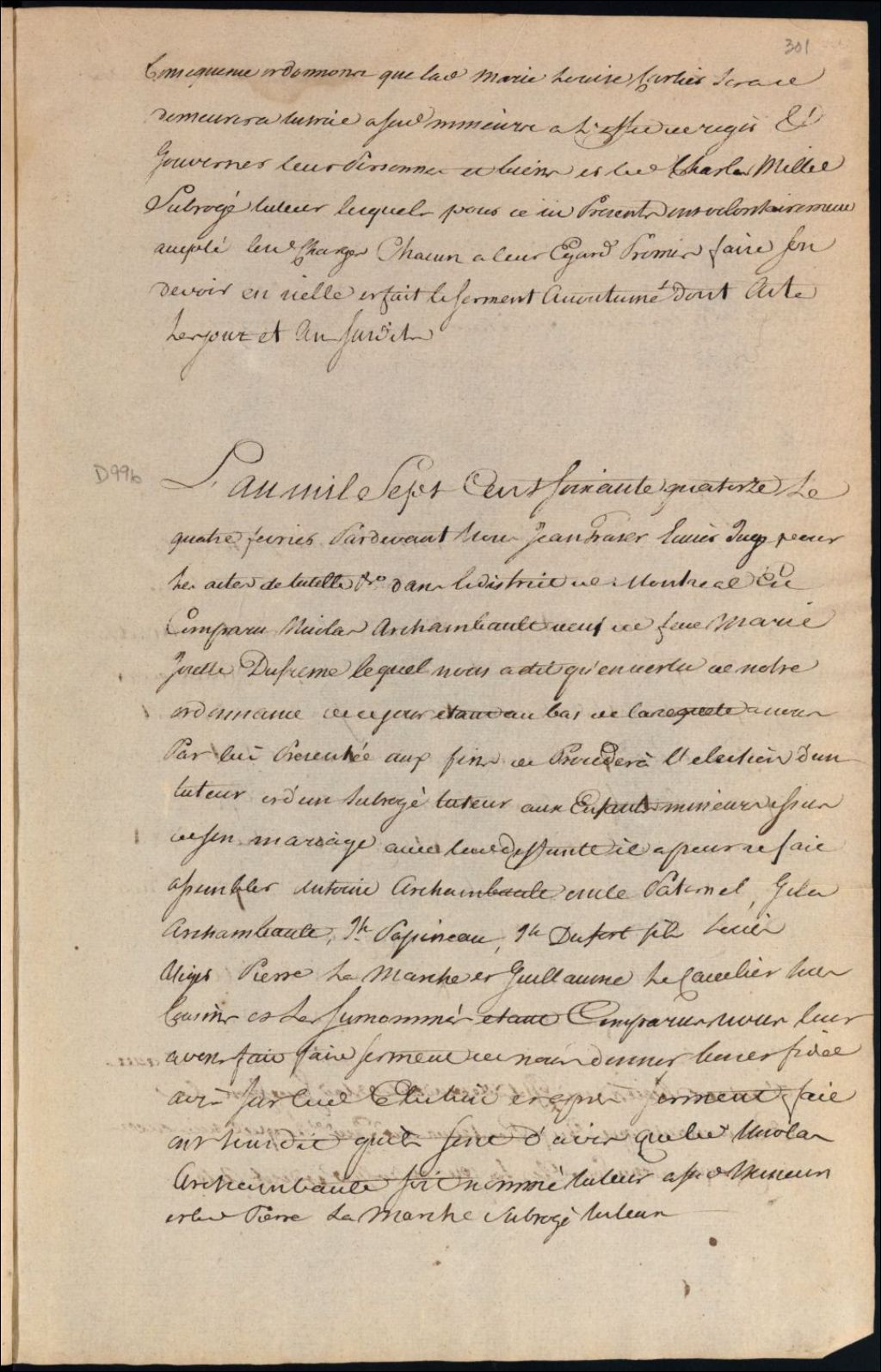 Tutelle des enfants mineurs de feu Marie Josèphe Dufresne et de Nicolas Archambault, 4 février 1774, Archives nationales à Montréal, Fonds Cour supérieure. District judiciaire de Montréal. Procédures en matières non contentieuses, (06M,CP601,S5,D996).