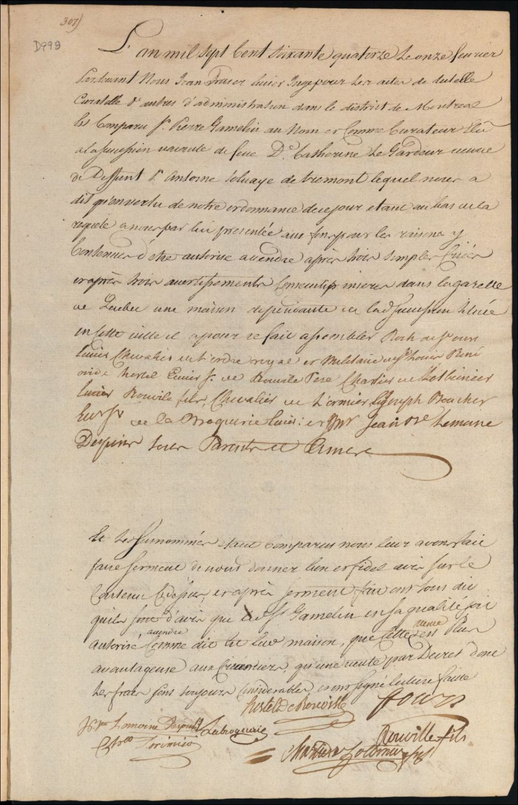 Curatelle de la succession vacante des défunts Antoine Salvaye Trémont et Catherine Legardeur, 11 février 1774, Archives nationales à Montréal, Fonds Cour supérieure. District judiciaire de Montréal. Procédures en matières non contentieuses, (06M,CP601,S5,D998).