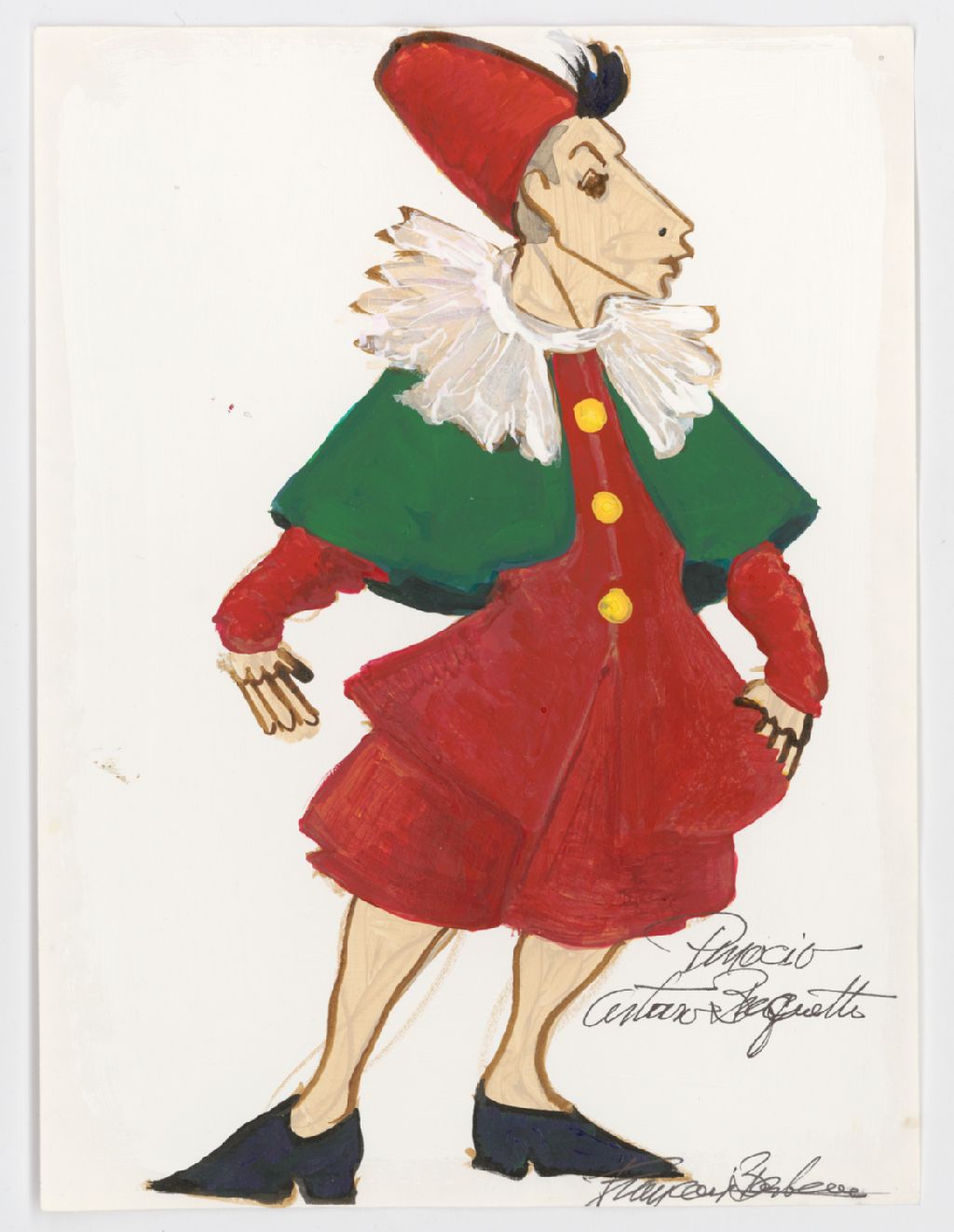 - Le dossier porte sur la confection des costumes d¿un spectacle d¿Arturo Brachetti, probablement « L¿homme au mille visages ». Il contient de la correspondance, des dessins à la gouache et à l'acrylique accompagnés d¿échantillons de tissus et des esquisses illustrant la création de costumes. Les photographies portent sur une séance d¿essayage avec l'artiste