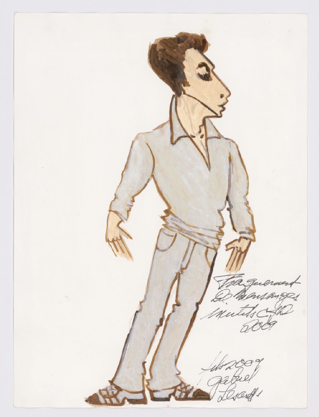 - Ce dossier contient des dessins et esquisses de costumes créés pour la pièce « Fragments de mensonges inutiles », où apparaissent les noms de Gabriel Lessard, Gabriel Sabourin, Linda Sorgini, Antoine Durand, Normand D¿Amour, Maude Guérin, Roger La Rue, Olivier Morin