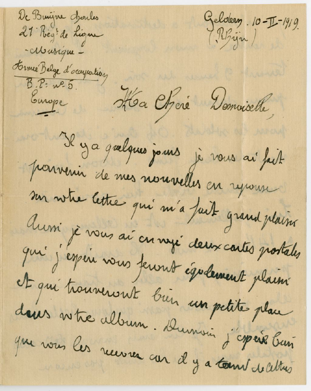 Correspondance de Charles de Bruyne à Gabrielle Pellerin, 10 février 1919