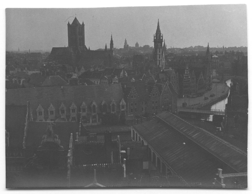 - Sur la photographie, prise par temps sombre et pluvieux, on aperçoit le Beffroi et la Cathédrale Saint-Bavon à Gand en Belgique