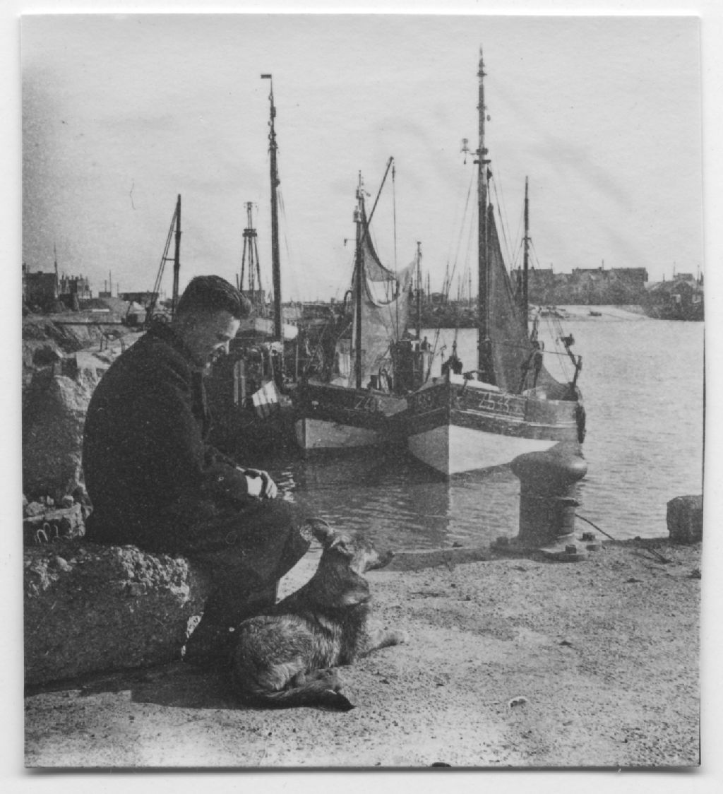 Léon de Bruyne accompagné de son chien à Zeebrugge, Avril 1946, Archives nationales à Rimouski, Fonds Gabrielle Pellerin, (01R,P29,D322,P3), Charles de Bruyne.