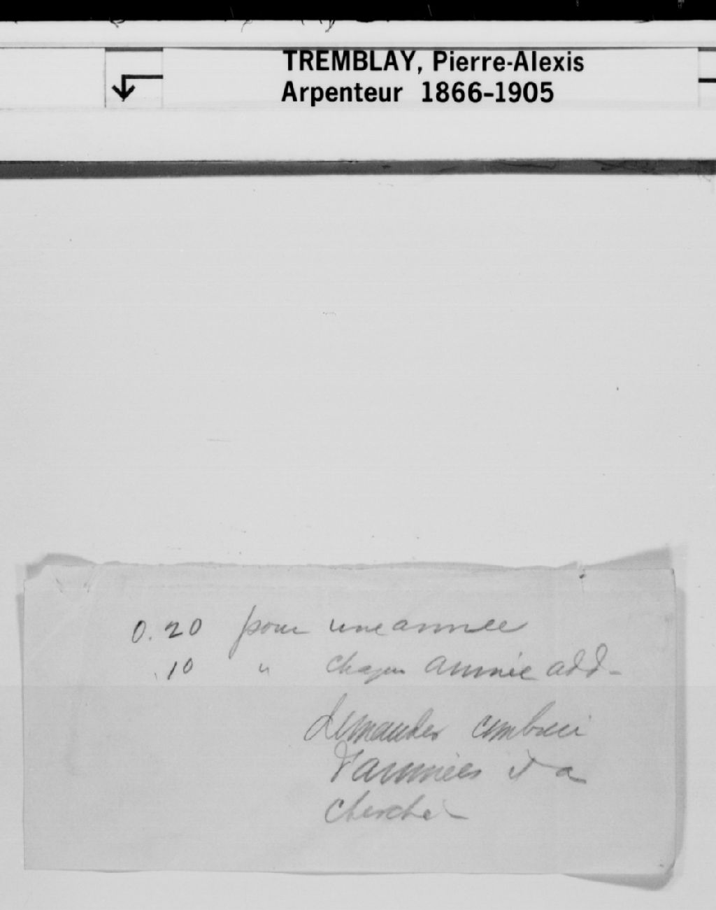 - Cette série regroupe les minutes du greffe de l'arpenteur Pierre-Alexis Tremblay, elle compte 74 pièces numérotées conservées dans des chemises numérotées, et un index dactylographié. Dans un versement subséquent, 6 autres actes de procès-verbaux ont été ajoutés au greffe. Ces derniers ne sont pas inclus à l'index dactylographié ni microfilmés.Le fonds comprend également deux carnets de comptes des clients de l'arpenteur et un carnet de notes relatives à des données de bornage et d'arpentages , non incluses dans les procès-verbaux officiels et couvrant la période entre le 20 juillet 1874 et le 22 août 1877.Prises dans leur ensemble, les données colligées dans ces documents officiels à contenu administratif et légal peuvent constituer une source documentaire des plus importantes sur l'arpentage des cantons et les individus propriétaires de ces lots pendant cette période. L'ensemble des dossiers se rapporte à des travaux d'arpentage effectués dans le comté Chicoutimi