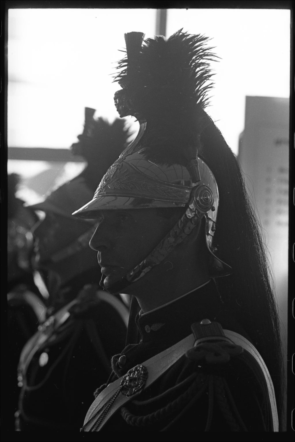 Cavaliers du Régiment de Cavalerie de la Garde Républicaine (Gendarmerie Nationale)., 1967, Archives nationales à Québec, Fonds Jules Rochon, (03Q,P743,P175), Jules Rochon.
