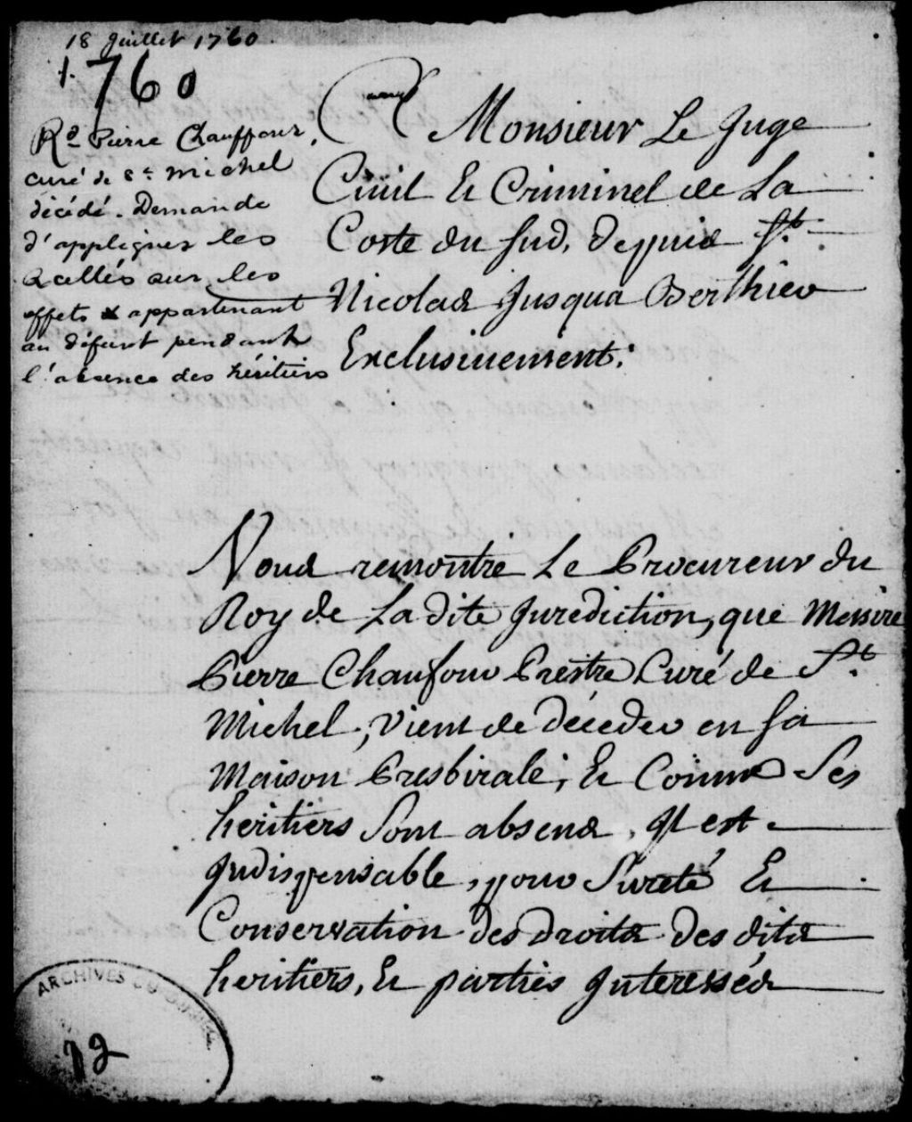 - Requête de François Lajus, procureur du roi en la juridiction de la Côte-du-Sud, au juge de la même juridiction, demandant de désigner un autre que lui pour apposer les scellés sur les effets appartenant à la succession de Messire Pierre Chauffour, curé de Saint-Michel, vu que les héritiers sont absents et que lui, requérant, demeure présentement au presbytère; Nomination, par Saillant, de Jean-Charles-François de La Houssaye, sieur d'Etreval, pour faire fonction de procureur du Roi et apposer les scellés. Le document est signé par Lajus, Saillant; Requête du procureur de La Houssaye au juge pour faire apposer les scellés sur les effets de feu Pierre Chauffour, curé de Saint-Michel; Ordonnance de Saillant qui se transporte au presbytère pour y apposer les scellés. Le document est signé par Saillant