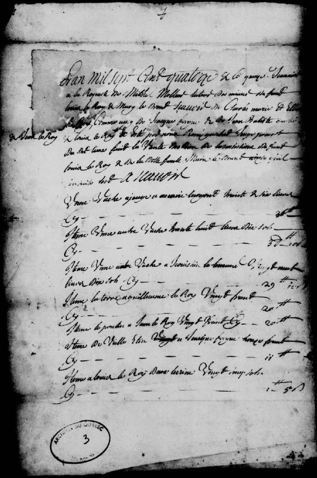 Procès-verbal incomplet de la vente faite par René Gaschet (Gachet), juge prévôt de la seigneurie de la Durantaye, des biens de la succession des défunts Louis Leroy (Roy) et Marie Ledran, à la requête de Michel Molleur (Moleur), tuteur de leurs enfants mineurs