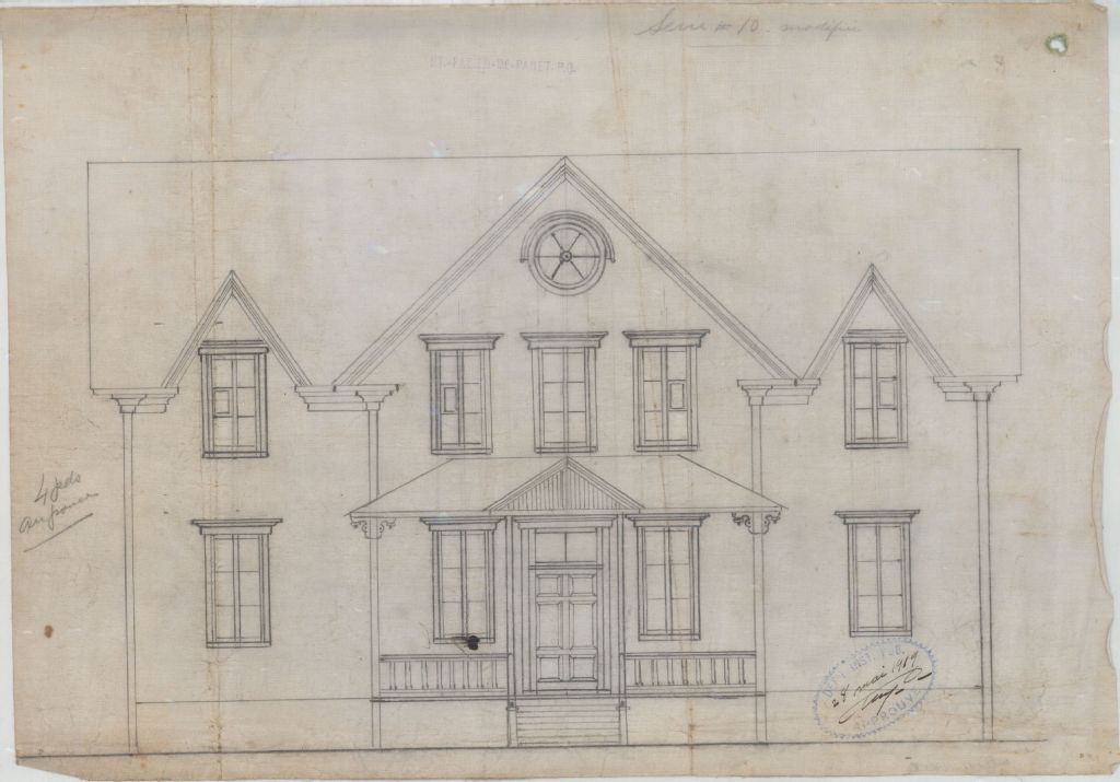 - Dossier relatif à la maison école de Saint-Fabien de Panet. Le dossier comprend, entre autres, un devis et des plans concernant la maison école et le hangar attenant à la maison. Pour la maison école, ce sont les plans A à E: plan (2); élévation (2); coupe (1) et pour le hangar, plans F à J: plan (1); élévation (1); coupe (2).Type de projet: école de rang