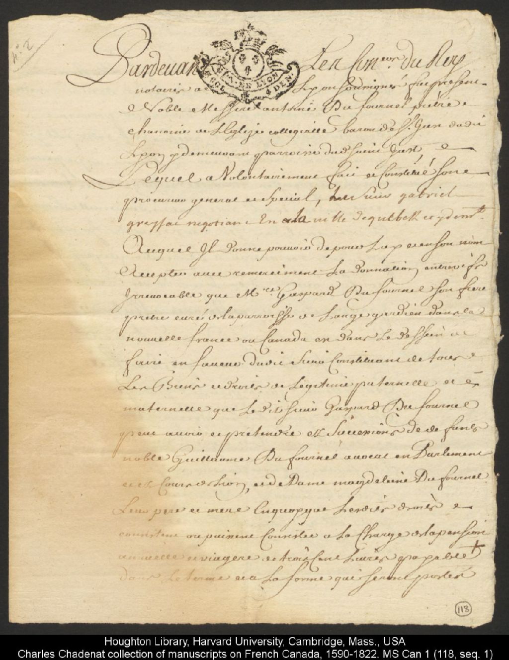 Procuration par noble messire Antoine Dufournel, prêtre chanoine de l'église collégiale, baron de Saint-Just, de Lyon, demeurant en la paroisse de Saint-Just, constitue comme son procureur le sieur Gabriel Greysac, négociant de la ville de Québec et y demeurant, au sujet de la donation entre vif par le sieur Gaspard Dufournel, son frère, prêtre curé de la paroisse de l'Ange-Gardien, est dans le dessein de faire au constituant, 4 mai 1736, Archives nationales à Québec, Collection Charles Chadenat collection of manuscripts on French Canada (MS Can 1), (03Q,ZE25,P118).