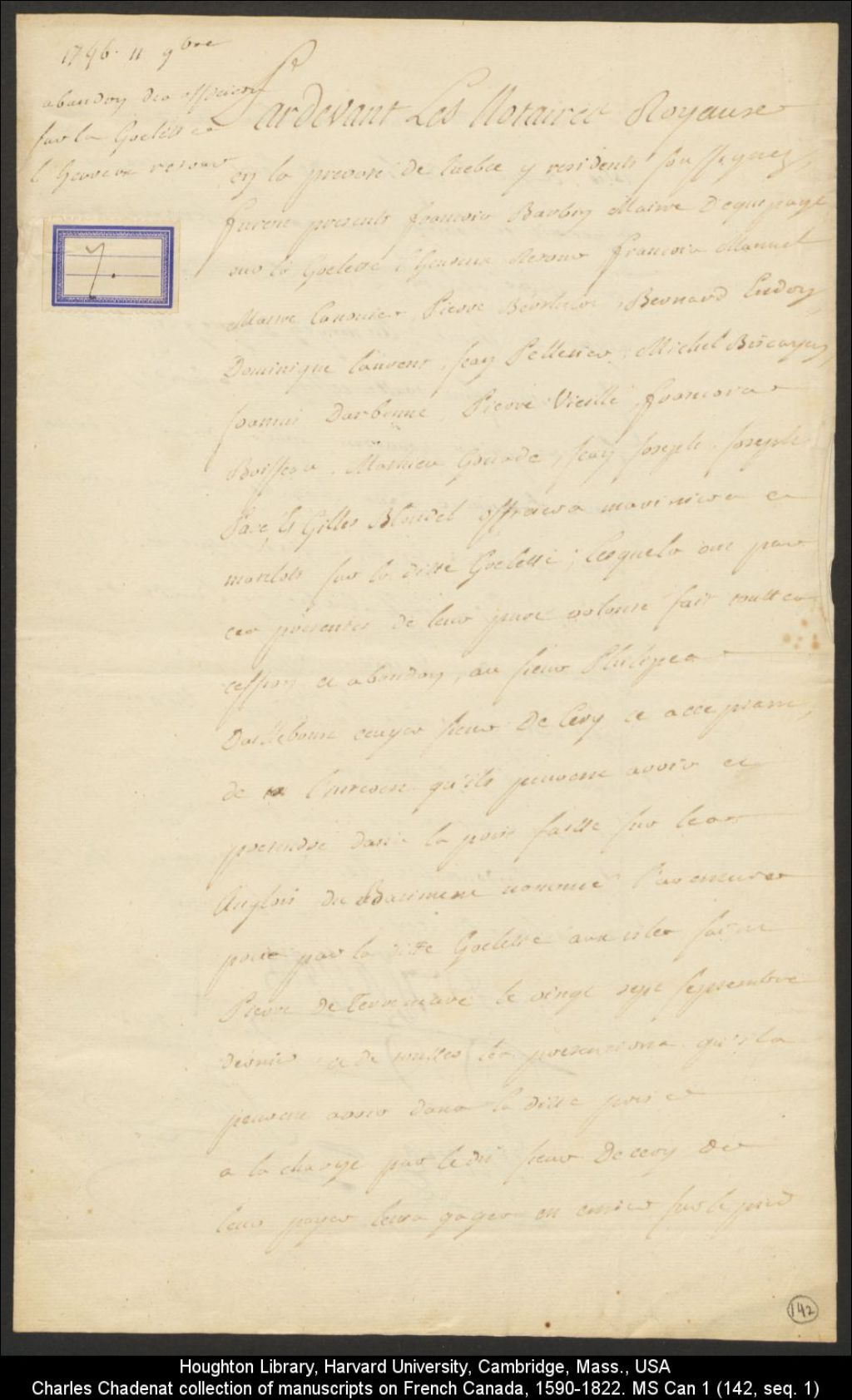 Abandon des officiers de la goélette "L'Heureux Retour", y sont mentionnés : François Barbon, maître d'équipage; François Manuel, maître canonnier; Pierre Berthelot; Bernard Endoy; Dominique Laurent; Jean Pelletier; Michel Biscayen; Joannis Darbonne; Pierre Vieille; François Boisseau; Mathieu Gourde; Jean Joseph; Joseph Paré et Gilles Blondel, officiers mariniers et matelots, ledit abandon au sieur Philippe D'ailleboust (Dailleboust), écuyer, sieur de Cery (Cerry), de toutes prétentions qu'ils peuvent avoir sur le bâtiment anglais nommé "l'Aventure", pris par ladite goelette aux îles Saint-Pierre de Terre-Neuve le 27 septembre 1746, 11 novembre 1746, Archives nationales à Québec, Collection Charles Chadenat collection of manuscripts on French Canada (MS Can 1), (03Q,ZE25,P142).