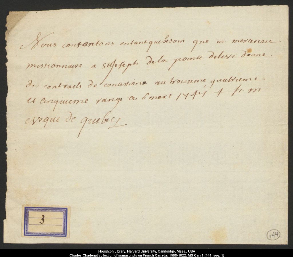 Autorisation accordée par Henri-Marie Dubreuil de Pontbriand, évêque de Québec, à Mercereau, missionnaire de Saint-Joseph de la Pointe-de-Lévy (Lévis) pour donner des contrats de concession aux 3e, 4e et 5e rangs (seigneurie de Lauzon), 6 mars 1747, Archives nationales à Québec, Collection Charles Chadenat collection of manuscripts on French Canada (MS Can 1), (03Q,ZE25,P144).