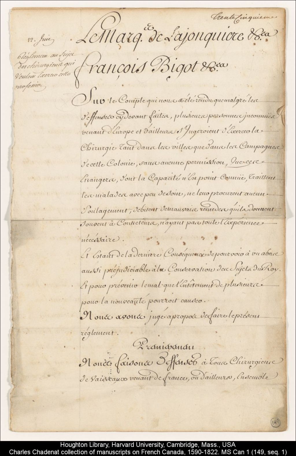 Ordonnance de La Jonquière et Bigot concernant l'exercice de la chirurgie au Canada (examen prescrit pour ceux qui veulent pratiquer ce métier, etc). En réaction au fait que plusieurs personnes inconnues venant d'Europe ou d'ailleurs exercent la chirurgien tant en ville qu'en campagne en Nouvelle-France sans permission, que leur compétence n'est point connue et qu'ils traitent les malades avec peu de soins, il est fait défense à tous les chirurgiens de vaisseau venant de France ou d'aillleurs de panser et médicamenter les malades en Nouvelle-France sans avoir préalablement subi un sérieux examen sur l'art de la chirurgien et avoir été jugé apte à l'exercer. Suit une commission d'huissier à Montréal pour François Quenel (Quenet, Guenet, Guenette)., 12 juin 1750, Archives nationales à Québec, Collection Charles Chadenat collection of manuscripts on French Canada (MS Can 1), (03Q,ZE25,P149).