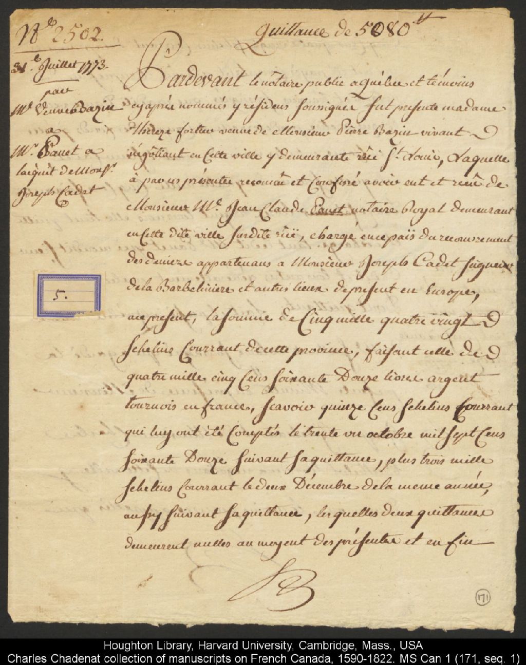 Quittance par Thérèse Fortier, veuve du feu sieur Pierre Bazin, de son vivant négociant de Québec, demeurante à Québec rue Saint-Louis, laquelle reconnaît avoir reçu de maître Jean-Claude Panet, notaire royal, demeurant à Québec sur le rue Saint-Louis, chargé du recouvrement des deniers appartenant à Joseph Cadet, seigneur de la Barbelinière et autres lieux, de présent en Europe, la somme de 5 080 shillings de cette province (soit 4 572 livres en argent tournois de France), 31 juillet 1773, Archives nationales à Québec, Collection Charles Chadenat collection of manuscripts on French Canada (MS Can 1), (03Q,ZE25,P171).