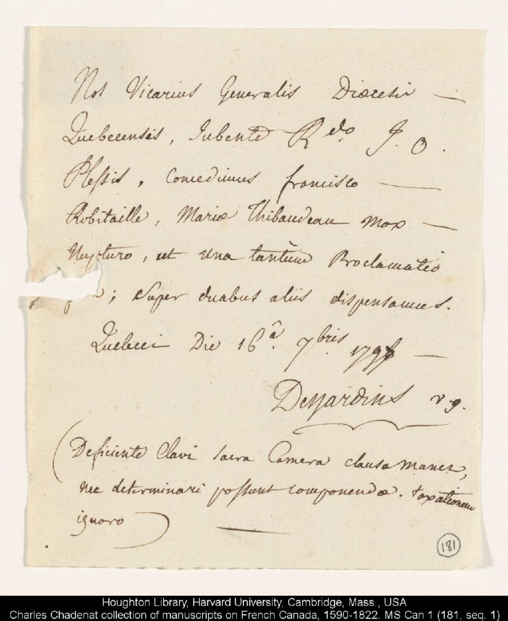 Dispense de publication de bans par [Philippe-Jean-Louis] Desjardins, vicaire général du diocèse de Québec, en faveur de François Robitaille et de Marie Thibaudeau, 16 septembre 1797, Archives nationales à Québec, Collection Charles Chadenat collection of manuscripts on French Canada (MS Can 1), (03Q,ZE25,P181).