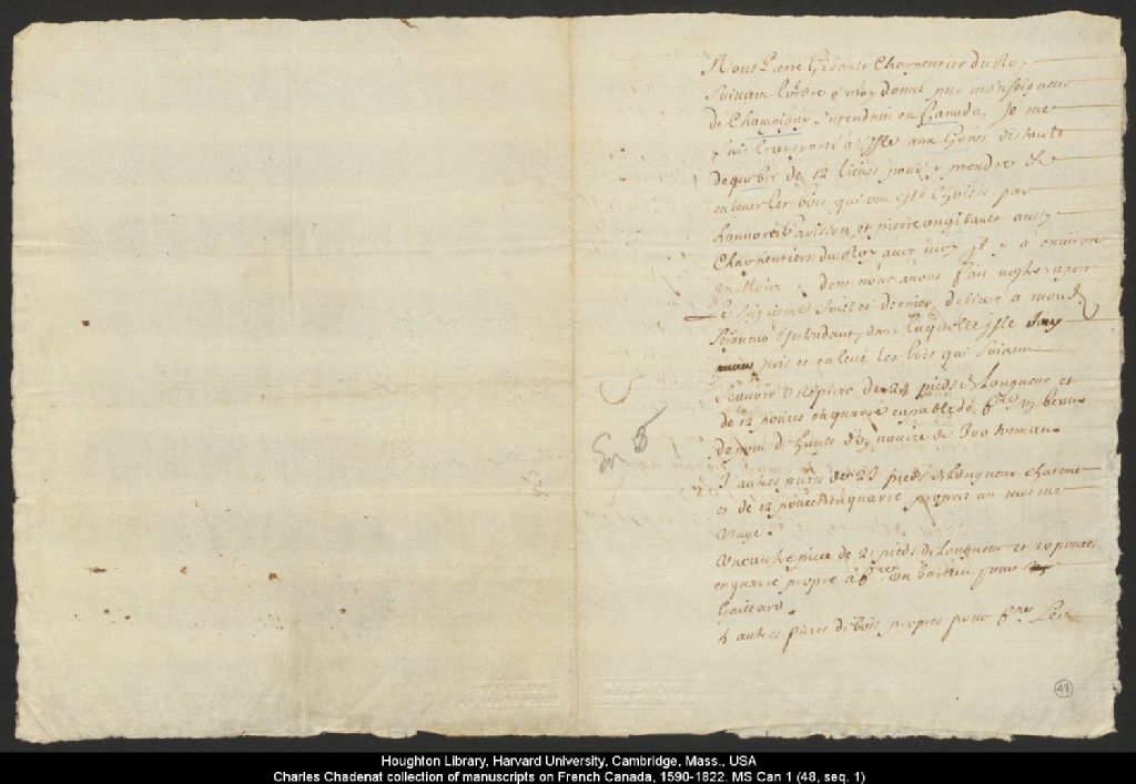 Procès-verbal de l'intendant de Champigny : ordre de l'intendant de Champigny à Pierre Gibault, charpentier du roi pour se rendre à l'île aux Grues, distante de Québec de 12 lieues, pour y prendre et enlever les bois qui ont été choisis par Honoré Pavisson et Pierre Angibault aussi charpentiers du roi et Gibault il y a environ un mois. Énumération des pièces de bois qui pourraient servir à la construction navale. Le bois a été enlevé de dessus l'habitation de Guillaume Lemieux habitant de ladite île aux Grues. Bois estimé par Michel Durouvray (Guyon dit Durouvray) charpentier de navire en Canada et commis et envoyé sur le lieu à 60 livres monnaie de France. Bois déchargé à bord du vaisseau du roi le Fourgon pour envoyer en France, 6 août 1687, Archives nationales à Québec, Collection Charles Chadenat collection of manuscripts on French Canada (MS Can 1), (03Q,ZE25,P48).