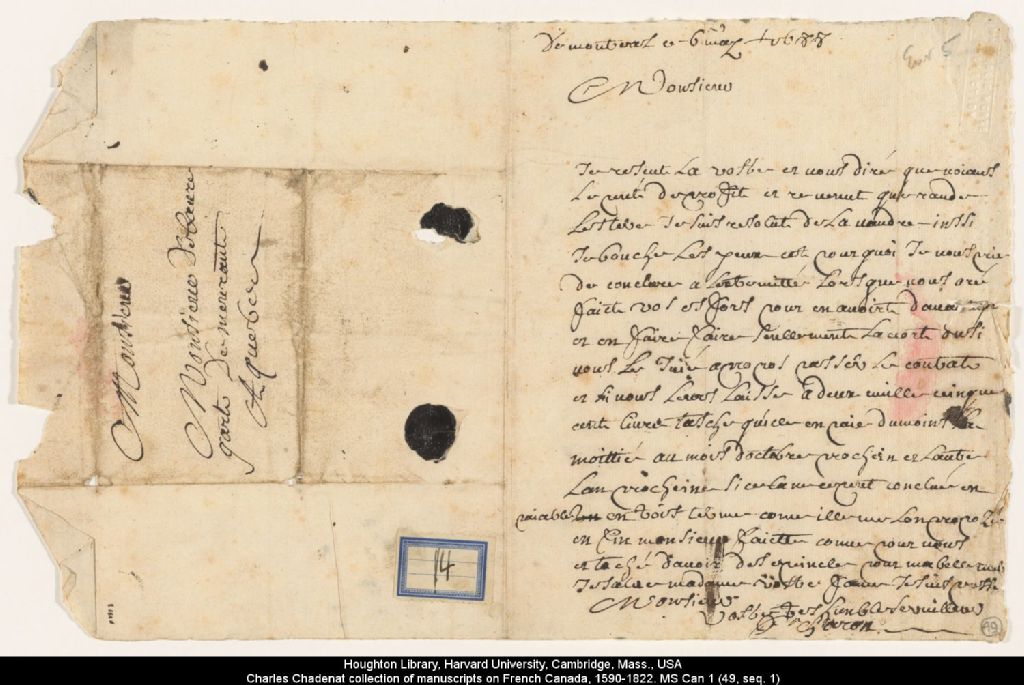 - Lettre de Charon [Jean-François Charon de La Barre], de Montréal, à monsieur de Beauregard demeurant à Québec à propos de la vente d'une terre, «voiant Le peut de profit et revenut que rande Les tere»