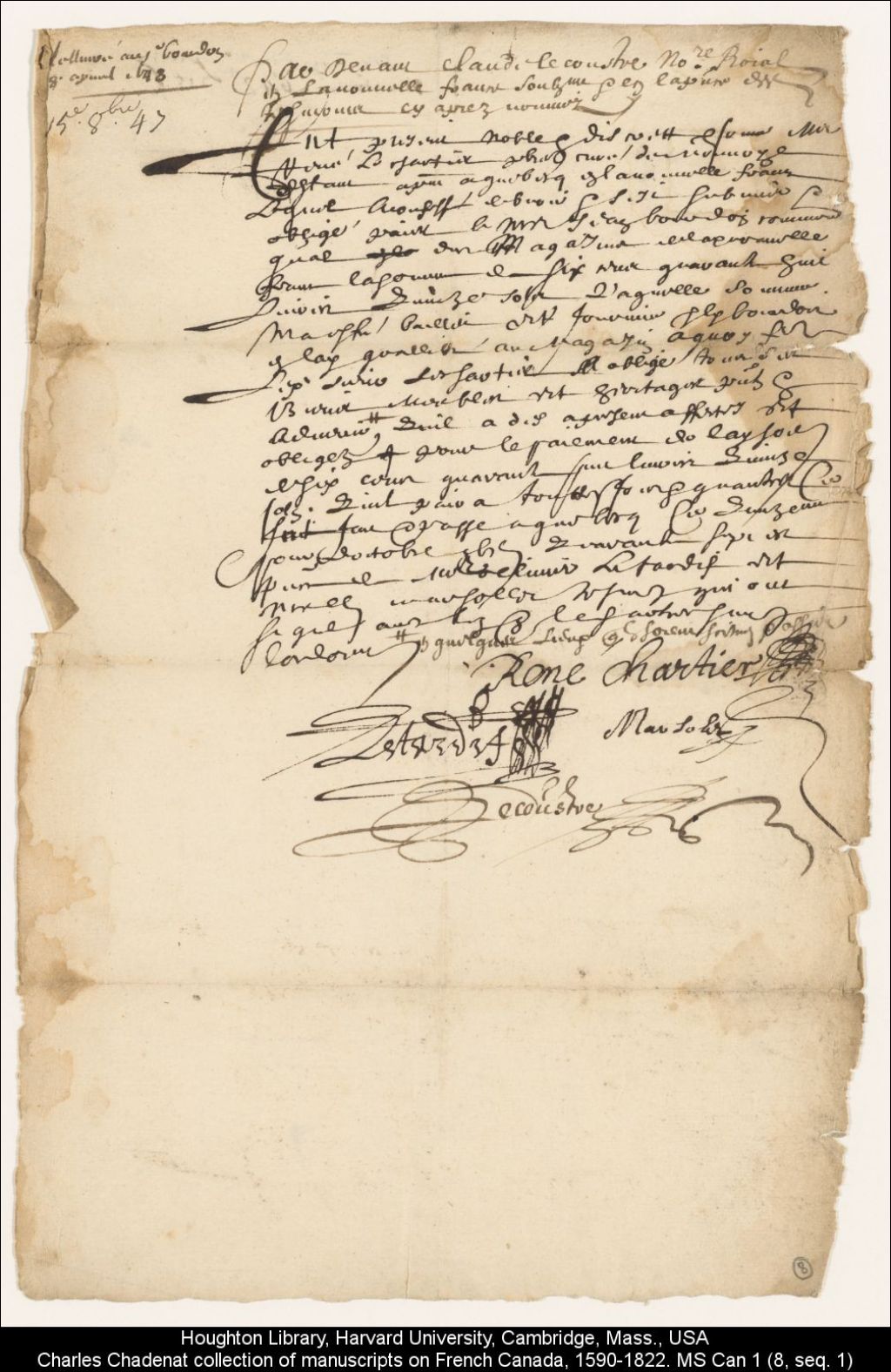 Obligation de l'abbé René Le Chartier à Jean Bourdon, receveur général des magasins de la Nouvelle-France, pour une somme de 648 livres, 15 sols, 15 octobre 1647, Archives nationales à Québec, Collection Charles Chadenat collection of manuscripts on French Canada (MS Can 1), (03Q,ZE25,P8).
