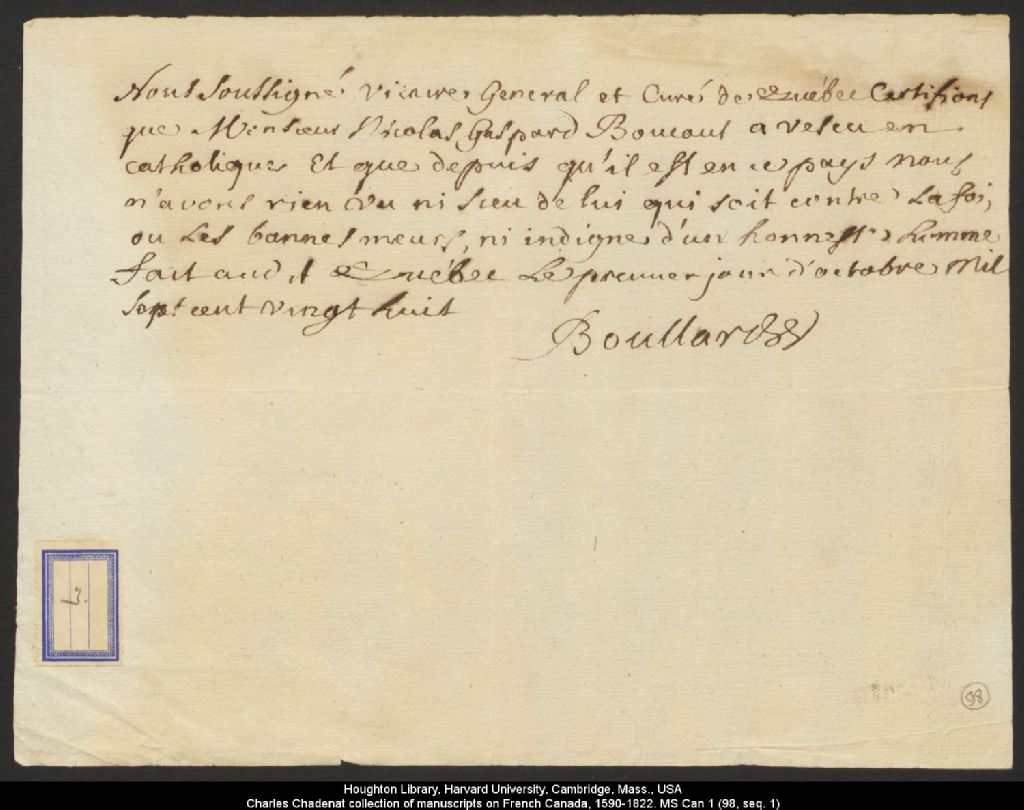 Certification par Boullard, vicaire général et curé de Québec, que Nicolas-Gaspard Boucault est catholique, qu'il a de bonnes mœurs et qu'il vit en honnête homme et ce, depuis qu'il est en Nouvelle-France, 1er octobre 1728, Archives nationales à Québec, Collection Charles Chadenat collection of manuscripts on French Canada (MS Can 1), (03Q,ZE25,P98).
