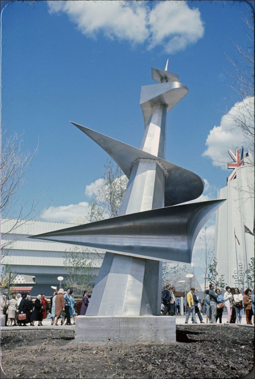 Sculpture « Obélisque oblique » de Henri-Georges Adam à l’Expo 67, 1967, Archives nationales à Montréal, Fonds André Sima, (06M,P586,S1,SS1,D1967-028), André Sima.
