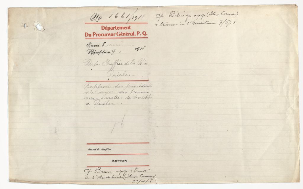 - Ce dossier comprend de la correspondance administrative, les noms des personnes arrêtées lors de l¿émeute et qui ont été trouvé coupables ou mis en accusation et surtout les témoignages des témoins des événements, des membres des familles des victimes, des militaires, des médecins et du maire de Québec recueillis lors de l¿enquête tenue devant le coroner pour le district de Québec George William Jolicoeur du 8 au 13 avril 1918 sur les causes de la mort de Honoré Bergeron, d'Alexandre Bussières, de Georges Demeule et d'Édouard Tremblay. Ce dossier est la source principale du livre de Jean Provencher : Québec sous la Loi des mesures de guerre 1918. Lux, 2014. 161 p. Coll. «Mémoire des Amériques». Une première édition avait été publiée en 1971 par les Éditions du Boréal Express. Grâce aux témoignages entendus par le coroner Jolicoeur on peut suivre l¿évolution des cinq journées qui précèdent la tuerie.Le dossier se subdivise en trois sections :A - Pages-couverture et correspondance administrative (8 pages; images 1 à 8)B - Noms des personnes arrêtées lors de l¿émeute. Voici deux qui ont été trouvé coupables ou mis en accusation (6 pages; images 9 à 14) :- William Aves, 4e avenue- Joseph Devarennes, rue Saint-Vallier- Mendoza Lachance, rue Bayard- John Howey, rue d¿Argenson- Gaudiose Loiselle, rue Arago- Abdon Gingras, rue Saint-Malo- Adélard Déchène, ville de Sherbrooke- Alfred Powers, cité de Montréal- Louis-Philippe Lucien Giroux, Beauport- Donald Dupéré, Beauport- Joseph Lemelin, rue Charest- Napoléon Martineau, Limoilou- Pierre Savard, rue du Pont- Jules Jolicoeur, rue Richardson- Roméo Robitaille, rue Saint-Jean- Eugène Marcoux, rue Saint-Mathias- Louis Gosselin, rue Arago- Napoléon Belleau, rue Latourelle- Émile Rochette, rue Saint-Léon- Lucien Miller, boulevard Langelier.- Deux soldats ont également été arrêtés pour vol sur la personne d¿Homère Guay :- John Nimmo, Johnston City, Illinois- Henry Christie, New Westminster, B.C.C - Témoignages entendus devant le coroner Jolicoeur entre les 8 et 13 avril 1918 (images 16 à 501) :Séance du 8 avril 1918 :- Séraphine Brien, veuve d¿Honoré Bergeron (3 pages; images 16 à 18).- Régina Ferland, veuve d¿Alexandre Bussières (4 pages; images 19 à 22).- Elzéar Ferland (1 page; image 23).- Lumina Bérubé, mère de Georges Demeule (2 pages; images 24 à 25).- Fidèle Tremblay, oncle de Joseph-Édouard Tremblay (1 page; image 26).- Henri-Edgar Lavigueur, maire de la Cité de Québec (55 pages; images 27 à 81).- François-Louis Lessard, major général de la milice canadienne (23 pages; images 82 à 104).Séance du 9 avril 1918 :- Joseph-Philippe Landry, brigadier général (46 pages; images 105 à 150).- Dr Albert Marois (25 pages; images 151 à 175).Séance du 10 avril 1918 :- Intervention de M. Picher, juré (4 pages; images 176 à 179).- Joseph Tremblay, plombier (5 pages; images 180 à 184).- Major George Robert Rodgers (46 pages; images 185 à 230).Séance du 11 avril :- Intervention de Maître Armand Lavergne (1 page; image 232).- Dr Georges St-Amand, médecin militaire, attaché au Deuxième Bataillon (16 pages; images 232 à 247).- Armand Lavergne, avocat (39 pages; images 248 à 286).- Joseph Mercier, gérant (10 pages; images 287 à 296).Séance du 12 avril :- Antoine Gobeil, avocat et ex-registraire sous la loi du Service Militaire (8 pages; images 297 à 304).- Révérend Isidore Evain, prêtre (23 pages; images 305 à 327).- Révérend Père Narcisse Cotnoir, prêtre (5 pages; images 328 à 332).- Capitaine Charles Desrochers, Inspecteur de la Police fédérale (16 pages; images 333 à 348).- J. Wilfrid Dion (21 pages; images 349 à 369).- Wilfrid Cantin (5 pages; images 370 à 374).- Francis D. Lafferty, Superintendant Dominion Arsenal (1 page; image 375).- Francis Caouette, constable de la Police municipale (6 pages; images 376 à 381).- Isidore Caouette, constable de la Police municipale (6 pages; images 382 à 387).- Ovide Landry et Alfred Boucher, Police municipale (1 page; image 388).- Émile Trudel, chef de la Police municipale (45 pages; images 389 à 433).Séance du 13 avril :- Capitaine Horace Scott (4 pages; images 434 à 437).- Major George Gooderham Mitchell (35 pages; images 438 à 472).- Émile Trudel, chef de la Police municipale (2 pages; images 473 à 474).- L¿Honorable Philippe-Auguste Choquette, membre du Sénat du Canada (7 pages; images 475 à 481).- Pierre Trudel, détective de la Police provinciale (1 page; image 482).- Témoin non identifié (5 pages; images 483 à 487).- Xavier Blouin, constable de la Police municipale (14 pages; images 488 à 501).Bibliographie sommaire :- Courtois, Charles-Philippe et Laurent Veyssière. Le Québec dans la Grande Guerre. Engagements, refus, héritages. Québec, Les Éditions du Septentrion, 2015. 212 p.- Provencher, Jean. Québec sous la Loi des mesures de guerre 1818. Lux, 2014. 161 p. Coll. «Mémoire des Amériques». Une première édition avait été publiée en 1971 par les Éditions du Boréal Express.- Renaud, Pierre-Yves et Martin Pâquet, «La Grande Guerre dans les rues de Québec», Le Devoir, 10 mars 2018, p. B10.- Richard, Béatrice. «1er avril 1918 Émeute à Québec contre la conscription : résistance politique ou culturelle?», dans Pierre Graveline (Sous la direction de), Dix journées qui ont fait le Québec, Montréal, vlb éditeur, 2013, p. 136-159.- Richard, Béatrice. «Le 1er avril 1918 ¿ Émeute à Québec contre la conscription : résistance politique ou culturelle?» donnée dans le cadre de la série Dix journées qui ont fait le Québec diffusée sur le Portail de BAnQ. (http://collections.banq.qc.ca/ark:/52327/2337125)
