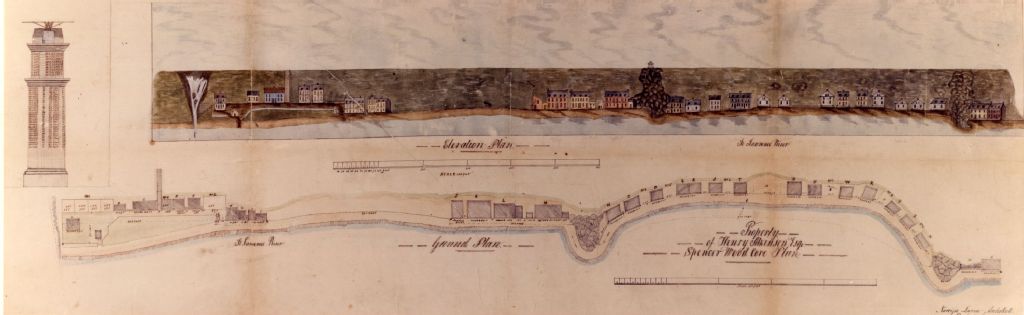 Plan et élévation des propriétés d'Henry Atkinson situées le long de l'anse Spencer Wood à Sillery. Sur ce plan figure le fleuve Saint-Laurent, le chemin des Foulons ou la rue Champlain, le relief, le calcul en pieds des facades des maisons et des distances entre elles et l'escalier menant en haut de la falaise.Appréciation esthétique: beau dessin en couleur