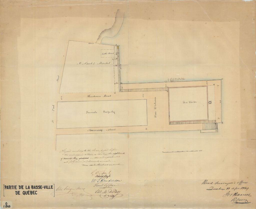 Sur ce plan d'un quai et d'un marché situés dans Saint-Pierre, ville de Québec, figurent la rue Saint-Paul, la rue Henderson, le marché Saint-Paul, une partie de la rivière Saint-Charles, les rues, le phare et le nom Quebec Gas Works