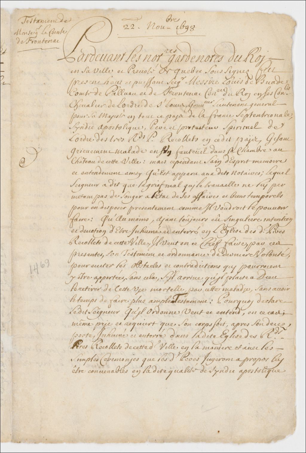 - Testament du gouverneur Louis de Buade, comte de Frontenac