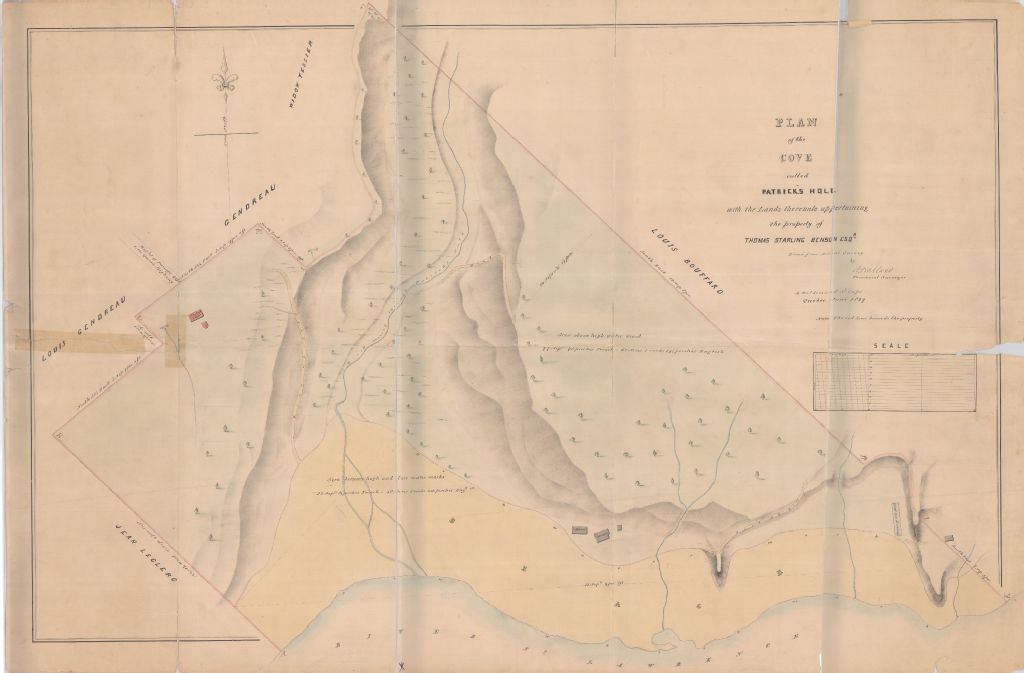 Sur ce plan de la baie dénommée Patrick's hole appartenant à Thomas Starling Benson située dans le quartier Saint-Laurent de l' île d'Orléans figurent le fleuve Saint-Laurent, les bâtiments, la structure du vieux moulin, le moulin, la végétation, les chemins, le relief et les noms Louis Gendreau, Jean Leclerc, Louis Bouffard et veuve Tessier