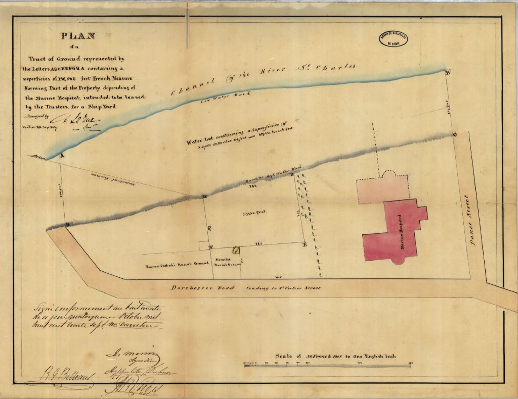 Sur ce plan d'une partie de terre située dans le quartier Saint-Roch de la ville de Québec figurent la rue Dorchester, la rue Gignac, l'hôpital de la Marine et une partie de la rivière Saint-Charles. On y retrouve également les cimetières, l'hôpital, la dimension des lots et les limites de la marée haute et de la marée basse