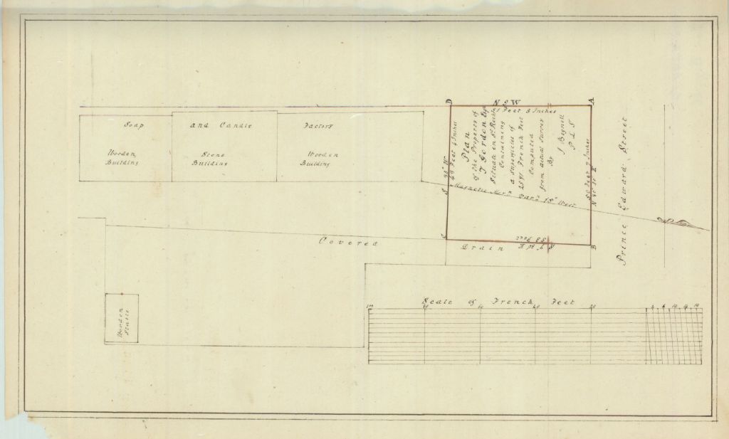 Sur ce plan d'une propriété située dans Saint-Roch, ville de Québec, figurent la rue du Prince-Édouard, les bâtiments, la manufacture de savon, la manufacture de chandelles, le canal souterrain et le nom T. Gordon Esq.