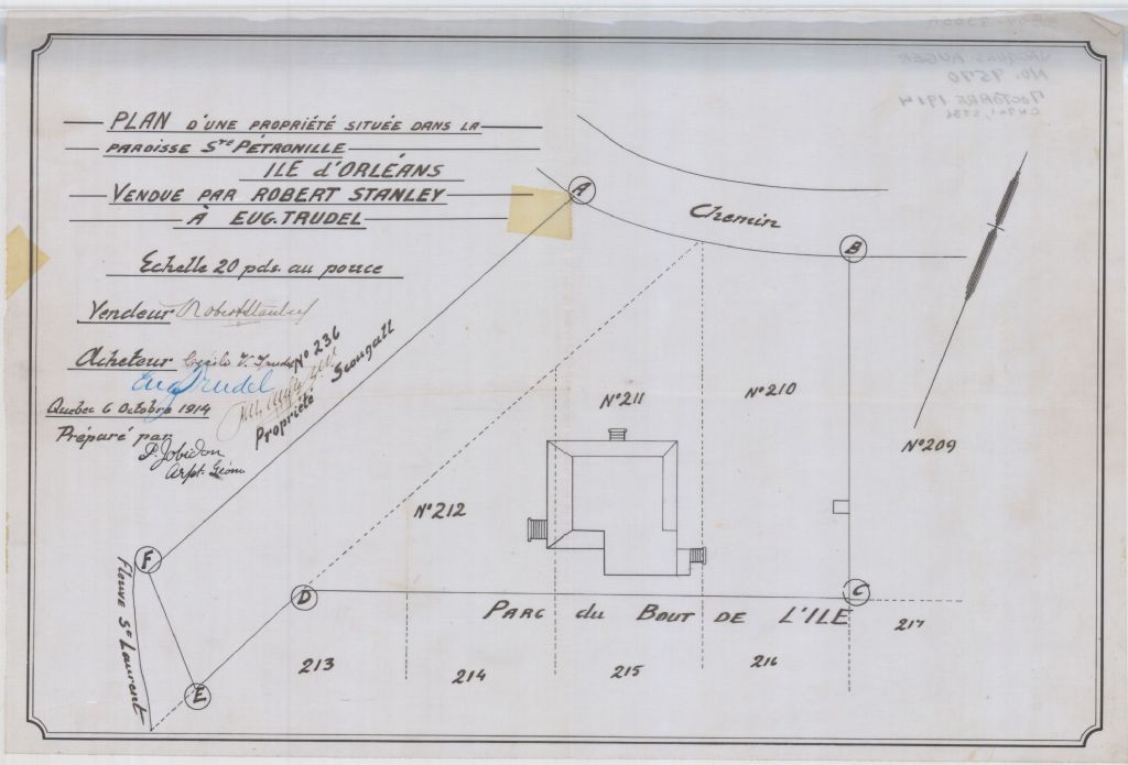 Plan d'une propriété située dans la paroisse Sainte-Pétronille, Ile d'Orléans vendue par Robert Stanley à Eug. Trudel