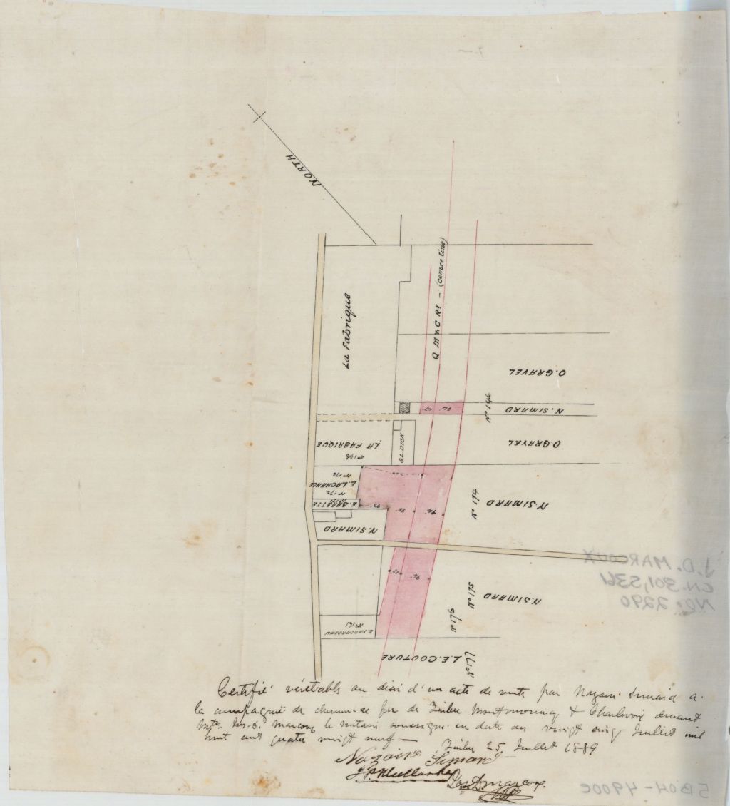 Sur ce plan des lots 143, 146, 161 et 172 à 177 du cadastre officiel de la paroisse de Sainte-Anne-de-Beaupré figurent les chemins, les bâtiments, le chemin de fer, le terrain de la fabrique et les dimensions de quelques lots. On y retrouvent également les noms suivants: L.E. Couture, Nazaire Simard, Élie Barette, Édouard Falardeau, E. Lachance, Olivier Gravel, G.L. Dick et La Compagnie de chemin de fer Québec, Montmorency et Charlevoix