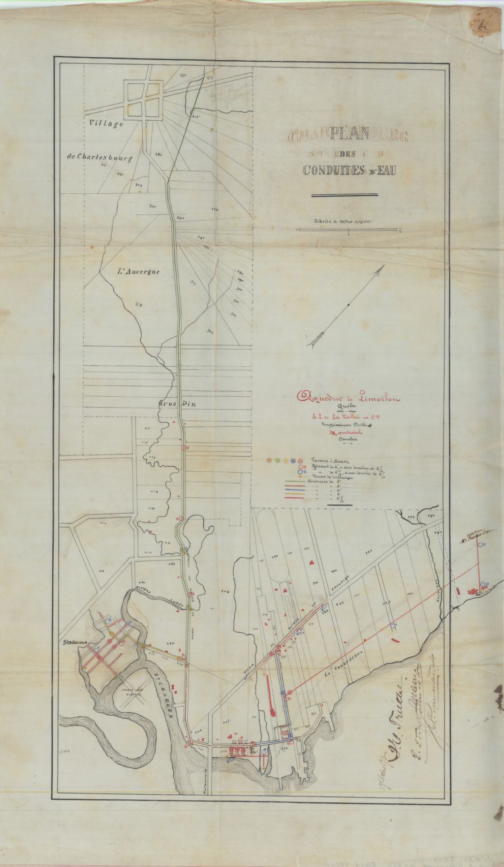 Sur ce plan de conduites d'eau et d'aqueduc situés dans Limoilou, ville de Québec, figurent une partie de la ville de Charlesbourg, une partie de la rivière Saint-Charles, la concession Gros Pin, la rivière Lairet, la concession L'Auvergne, le lieu-dit La Canardière, le domaine Maizerets et la rivière du Moulin. On y retrouve également tous les numéros du cadastre officiel de la paroisse de Saint-Roch-Nord, les vannes, les conduites, les bornes-fontaines, les bâtiments, la tannerie, la corderie, les ruisseaux, les ponts, les quais et les chemins. Figurent également sur le plan les noms suivants: Corporation municipale de Limoilou et E.L. de La Vallée & Cie