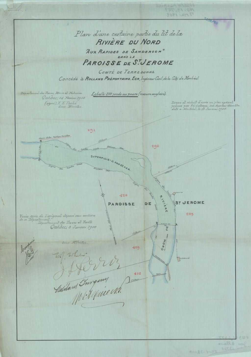 Sur ce plan d'une partie du lit de la rivière du Nord située dans la paroisse Saint-Jérôme figurent le barrage Wilson, les rapides de Sanderson et les lots 289, 290, 291, 428, 429 et 432 du cadastre officiel de la paroisse de Saint-Jérôme. On y retrouve également la ligne des hautes eaux, les bâtiments, le pont, le barrage, le chemin de fer, la clôture, le pouvoir hydraulique et la superficie d'une partie du lit de la rivière. Figurent également sur le plan les noms : Rolland Préfontaine, Allaire, Léveillé, chemin de fer Canadien Pacifique et J. C. Wilson & Co Ltd.